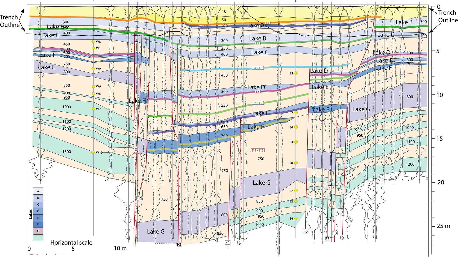 Comme les deux types de dépôts sédimentaires du bassin se distinguent très aisément grâce à leur composition et leur granulométrie (argile vs sable et clasts), il a notamment été possible de mettre en évidence une accélération très marquée de la sismicité il y a environ 1000 ans, lors du remplissage du lac Cahullia, après une longue période asséchée. Une fois le bassin de nouveau rempli la sismicité est revenue à un niveau plus modéré, suggérant une réponse sismique de la faille à l’état transitoire de remplissage du lac. Étant donné la géométrie de la faille, qui se trouve au milieu du lac, le différentiel de masse n’est pas l’hypothèse privilégiée pour le facteur contrôlant l’augmentation temporaire de la sismicité, mais plutôt la percolation des fluides dans la zone de faille qui peuvent, entre autres réduire localement la contrainte normale sur les surfaces de la faille.