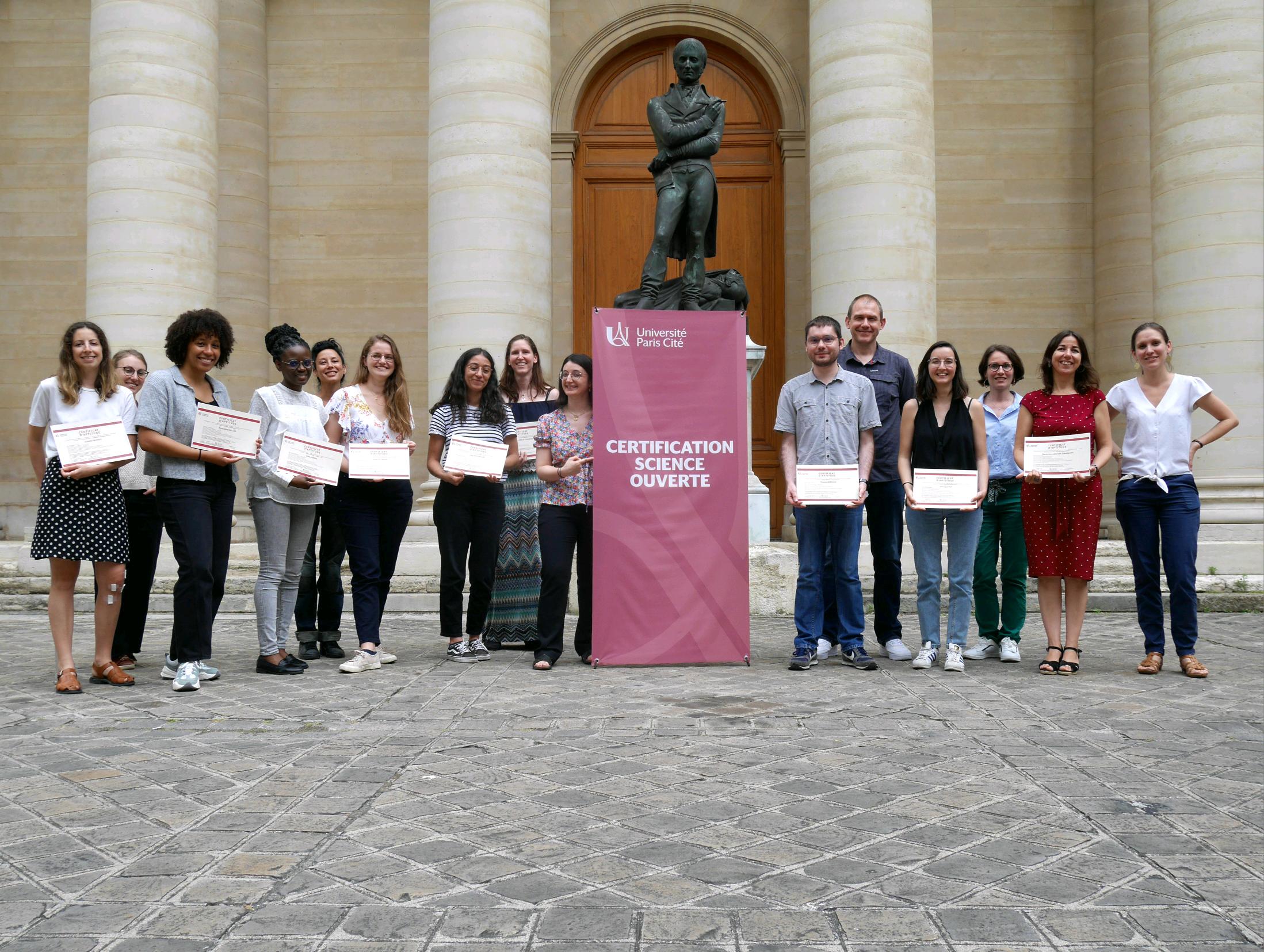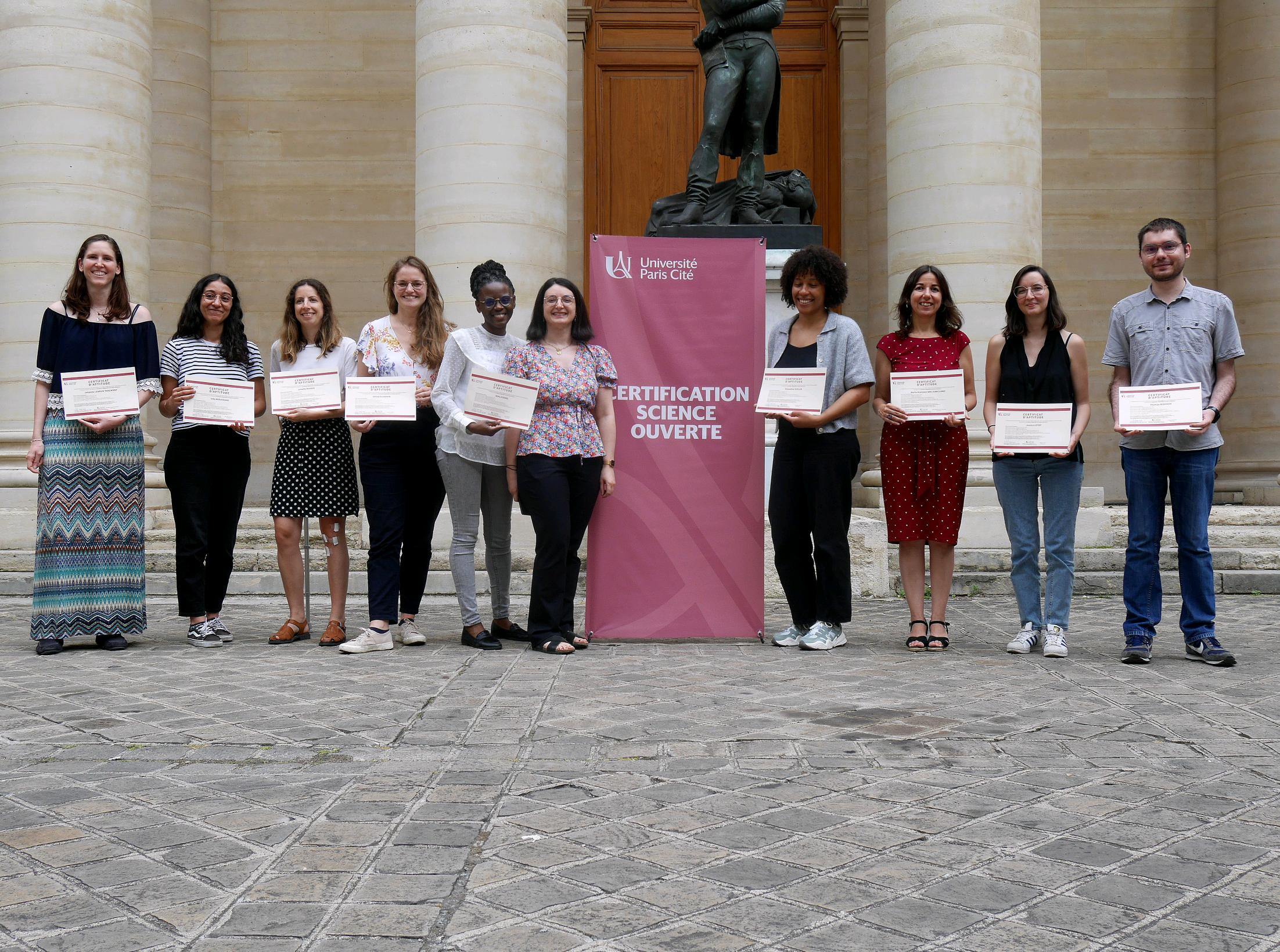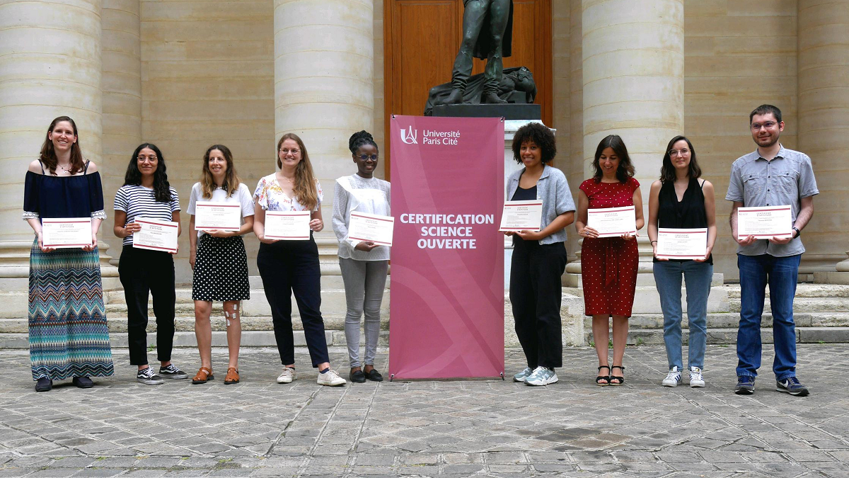 Le 19 juin 2023, les bibliothèques d’Université Paris Cité, en partenariat avec le Collège des Écoles Doctorales, ont décerné le certificat « Science Ouverte » à une cohorte de dix doctorantes et doctorants ayant suivi le programme de formation dédié au cours de l’année universitaire 2022-2023.
