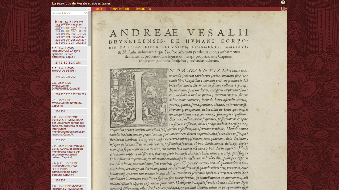 Début du texte latin (transcription et traduction accessibles en haut à gauche), dans l’interface de La Fabrique de Vésale.