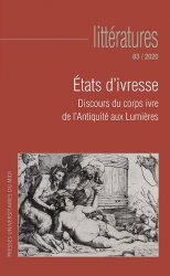 Objet avéré du dialogue des disciplines, le corps ivre fait partie à la fois des corps intéressant la plasticité de la représentation littéraire et des corps socialement problématiques. En effet, l’ivresse peut apparaître comme un moyen toléré de dépasser les bornes ou, à l’échelle individuelle, d’aménager les règles de la mémoire et de l’oubli de soi au profit de cette transgression. Le corps ivre met en jeu l’identité et ses modes de subjectivation, le rapport du corps et de l’esprit et celui du normal et du pathologique ; prompt au juron et au blasphème, lieu de la parole échappée, il interroge les normes tant laïques que religieuses du licite et de l’illicite, du tolérable et de l’obscène ou du « bas » ; et il est aussi un corps genré. De l’Antiquité aux Lumières, ce dossier de Littératures s’interroge sur les cadres et les codes de la « bonne » et de la « mauvaise » ivresse, au carrefour de l’histoire, de l’anthropologie, de la littérature et des arts.