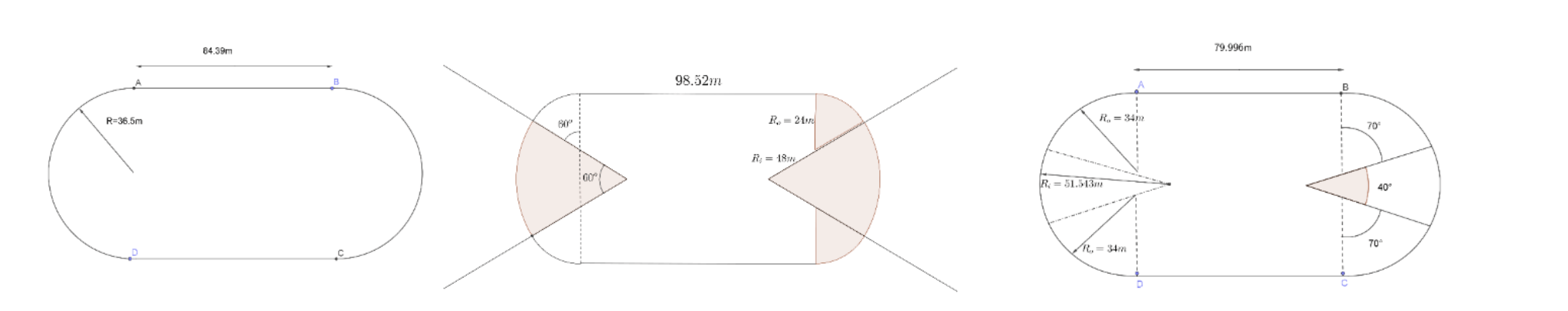 De gauche à droite : piste standard, formée de deux lignes droites de 84,3 mètres ; les deux types de piste à anses de panier © Amandine Aftalion, Centre d’analyse et de mathématique sociales (CNRS/EHESS)