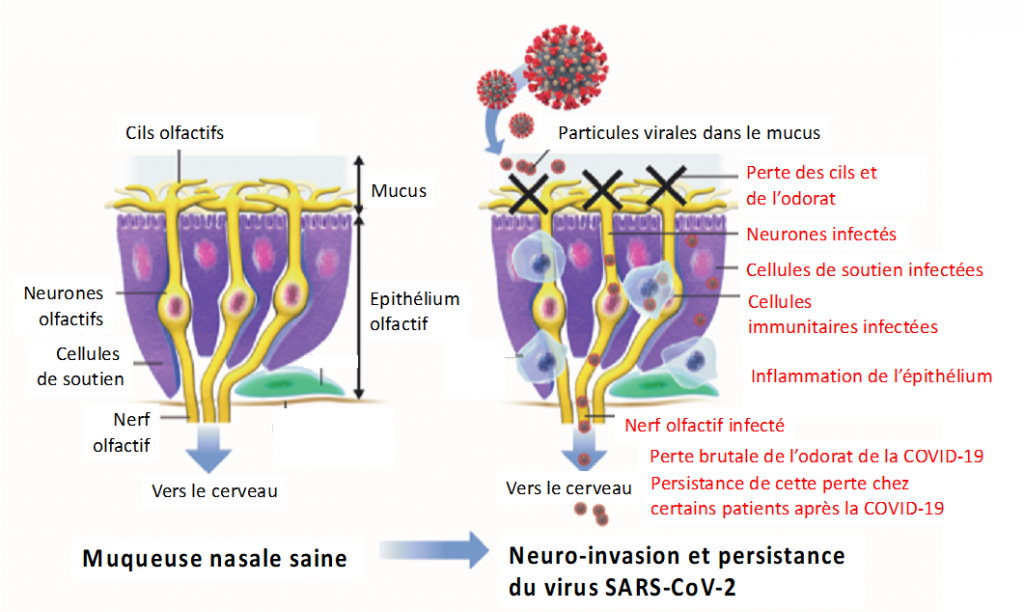 Cette étude montre que la perte de l’odorat est aussi la conséquence d’une dégradation de l’organe sensoriel situé au fond des cavités nasales. « En effet nous avons constaté que les neurones sensoriels sont infectés par le SARS-CoV-2, mais aussi le nerf olfactif et les centres nerveux olfactifs dans le cerveau », commente Pierre-Marie Lledo, chercheur CNRS, responsable de l’Unité Perception et mémoire (Institut Pasteur/CNRS) et co-auteur responsable de l’étude.