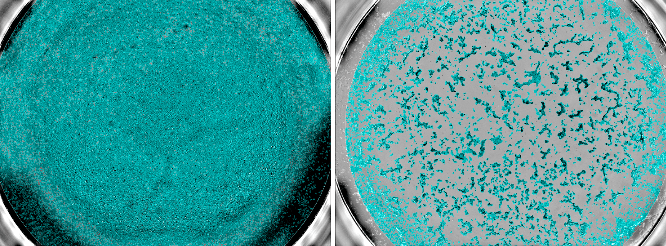 Echantillons sanguins dans la cohorte Constances et tests sérologiques de l’infection au virus SARS-Cov-2. A gauche : des cellules non infectées par le virus SARS-CoV-2, preuve que l’échantillon de sang contenait des anticorps neutralisants capable d’empêcher le virus d’entrer dans les cellules. A droite : de nombreuses cellules ont été détruites, preuve de l’absence d’anticorps neutralisants contre le virus. ©Unité des Virus Émergents (Inserm – Aix Marseille Université – IRD)