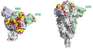 Visualisation 3D des mutations de la Spike du variant Omicron. (Gauche : vue de dessus. Droite : vue latérale). Les mutations sont indiquées en rouge. Elles sont présentes sur toute la protéine Spike, mais s’accumulent au niveau de la zone de liaison au récepteur (Receptor Binding Domain ou RBD) et dans une région appelée N-terminal Domain (NTD). © Institut Pasteur – Félix Rey