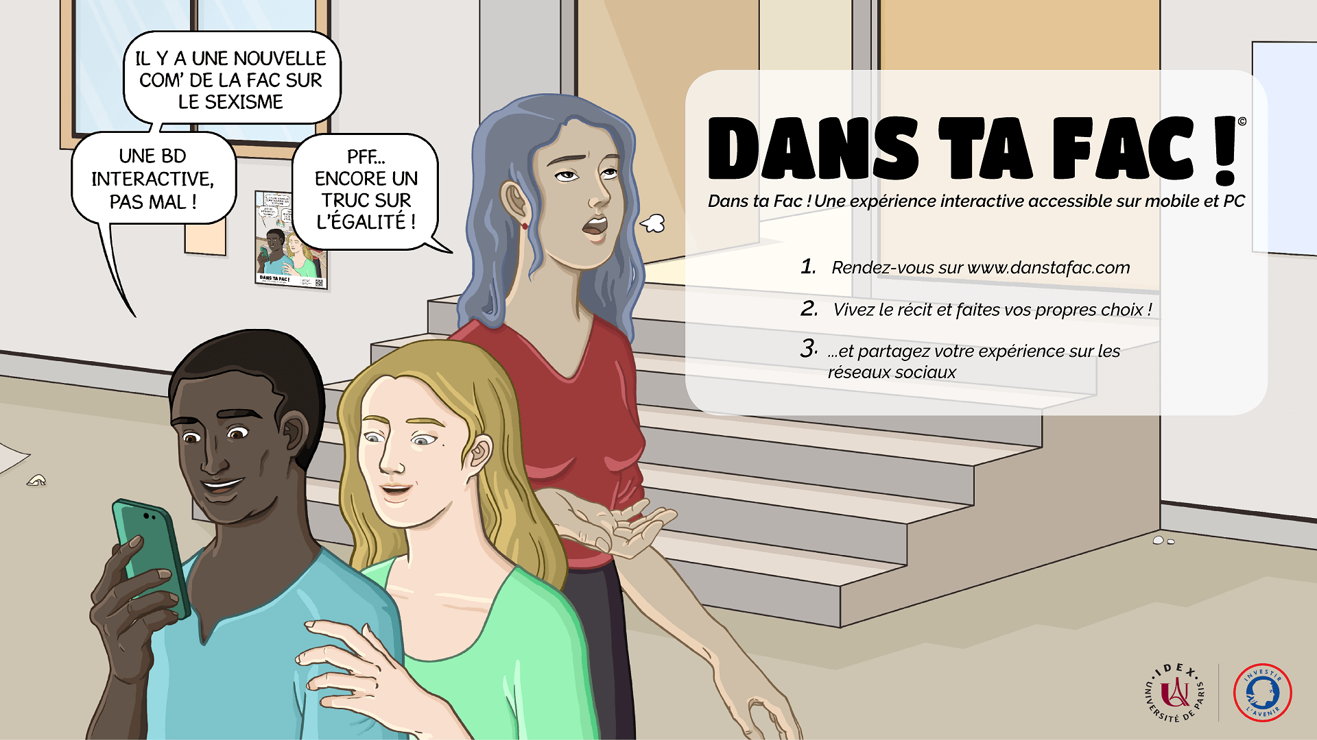 DANS TA FAC est une série de BD interactives sur les violences sexistes et sexuelles en quatre épisodes qui vous plonge au cœur du récit et vous amène à faire vos propres choix. Elle aborde les sujets du harcèlement sexuel, du cyber harcèlement, des stéréotypes de genres. dans le contexte étudiant ou dans la sphère professionnelle.