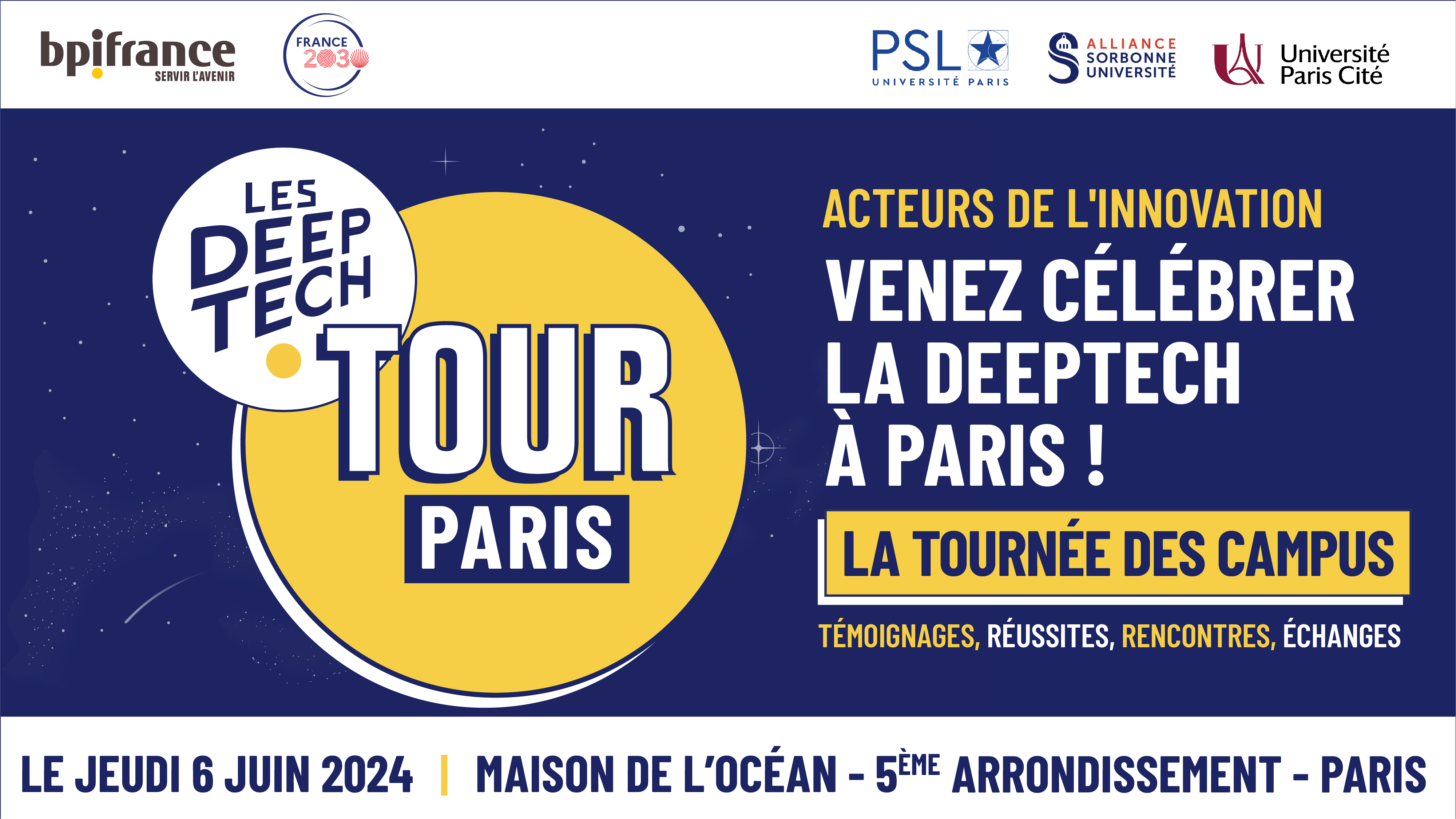 - 16h : Discours d’introduction en présence d’Alain Fuchs, Président de l’Université PSL, Stéphanie Allassonnière, Vice Présidente de l’Université Paris Cité, Elisabeth Angel Perez, Vice-Présidente de Sorbonne Université et Paul-François Fournier, Directeur Exécutif Innovation de Bpifrance.