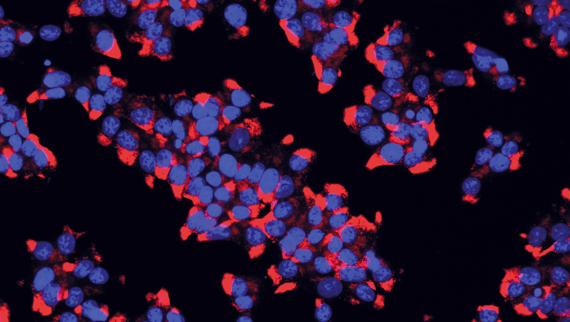 Cellule bêta pancréatique humaine. Les noyaux des cellules sont colorés en bleu et l’insuline contenue dans les cellules est en rouge.