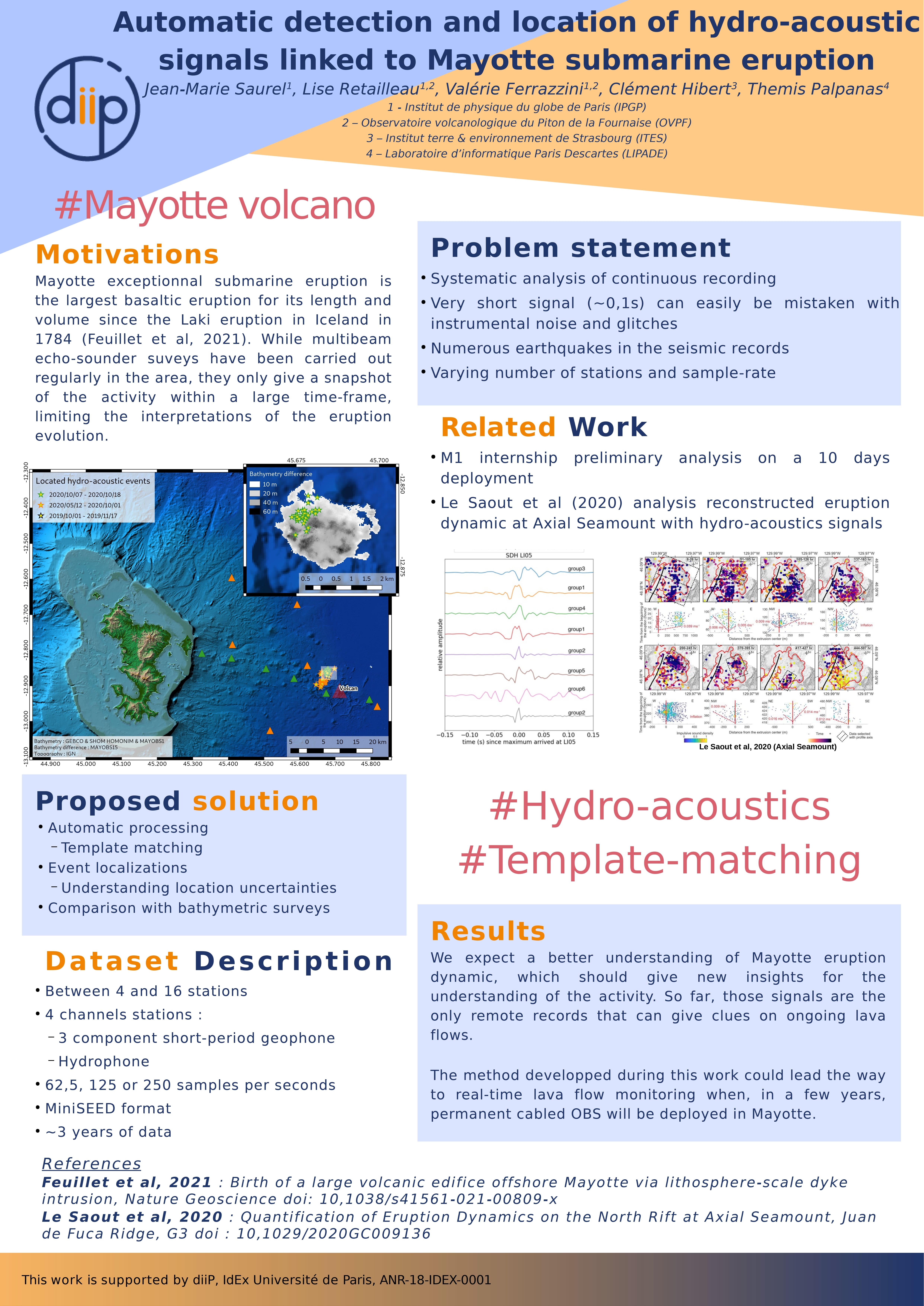 The goal of this internship is to automatically detect and locate the hydro-acoustic signals on the continuous OBS recordings since the first deployment in February 2019. The proposed work is to first use template matching type algorithms to detect those weak signals in the continuous data record. This will first allow to assess hydro-acoustic activity level evolution along the eruption. Next, those signals will be located and the location accuracies will be assessed using the numerous water sound velocity measures performed during marine surveys. Finally, the locations will be compared and associated to the lava flows identified during bathymetry surveys.