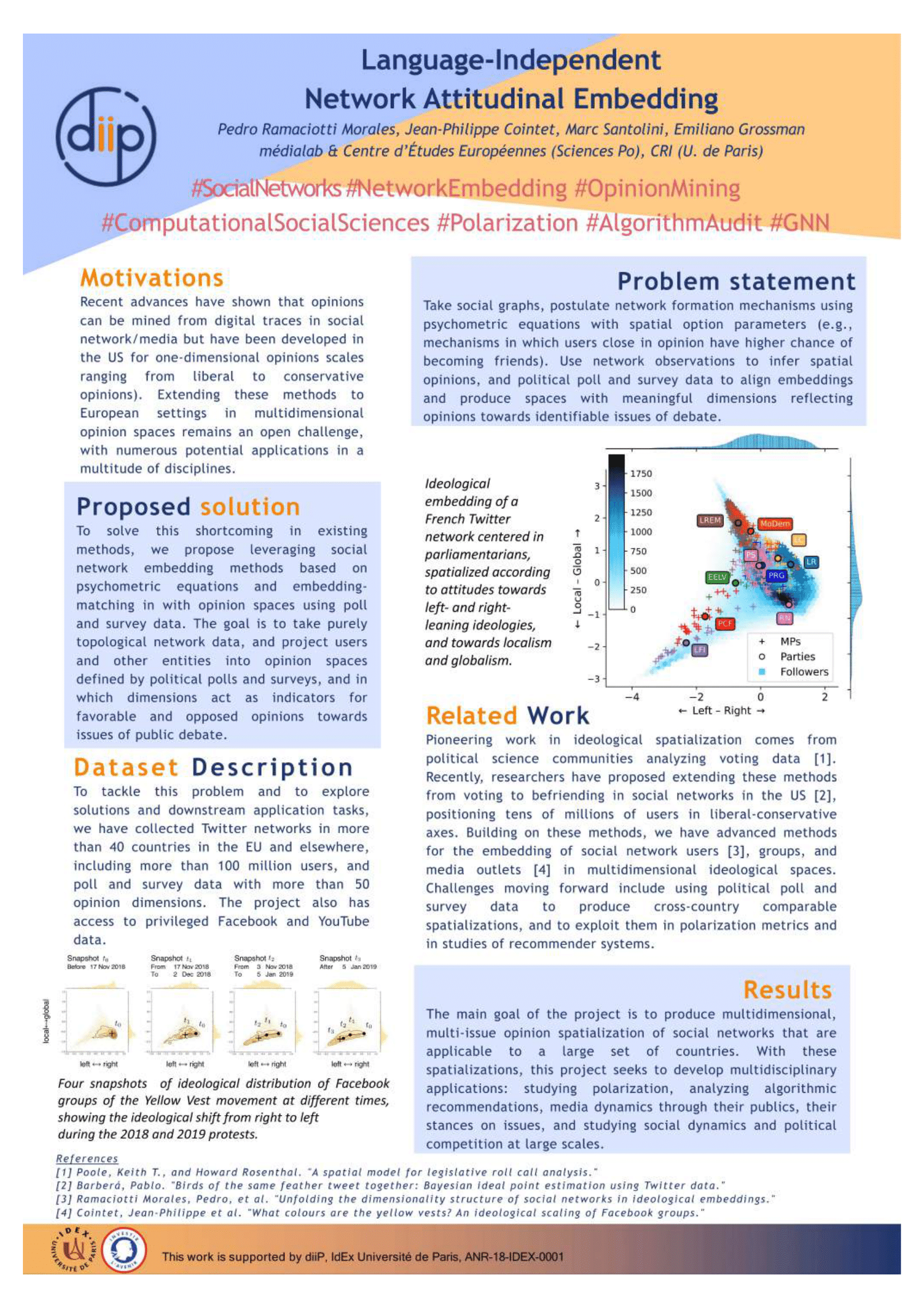 Public opinion on different issues of public debate is traditionally studied through polls and surveys. Recent advancements in network ideological scaling methods, however, show that digital behavioral traces in social platforms can be used to infer opinions at a massive scale. Current approaches allow to position social network users on ideological scales ranging extreme left- to extreme right-wing stances. This is suited for two-party systems and binary social divides, as the case of the US. However, no similar methodology exists for European (and other) settings, where public political debate is structured along several different issues and cleavages, and party systems impose a multi-polar landscape. To overcome this gap, we propose a novel approach that mixes ideological scaling of social graphs with external attitudinal data. The former uses social network structures to embed users in spaces where dimensions are informative of ideological traits. The latter provide stances for a few users on attitudinal scales (from most opposed to most favorable) for a range of well-identified issues of public debate: e.g., taxation, immigration, European integration, environmental protection, civil liberties. Mixing the two, we aim at embedding a massive number of users in attitudinal spaces where positions along several dimensions indicate opinions towards identifiable issues structuring public debate. Attitudinal embeddings finds numerous applications explored within the project, from recommendation algorithm audit and design, to the study of party systems and political competition online, polarization, and informational and media dynamics.