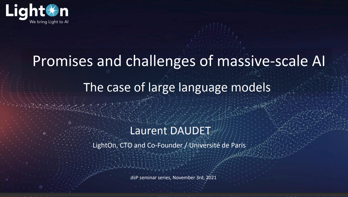 At LightOn – a spinoff of university research -, we develop a set of technologies to address these challenges. The Optical Processing Unit (OPU) technology makes some matrix-vector multiplications in a massively parallel fashion, at record-low power consumption. Now accessible on-premises or through the cloud, the OPU technology has been used by engineers and researchers worldwide in a variety of applications, for Machine Learning and scientific computing. We also train in an efficient manner large language models, such as PAGnol (demo at https://pagnol.lighton.ai ), the largest language model in French, that can be used for various