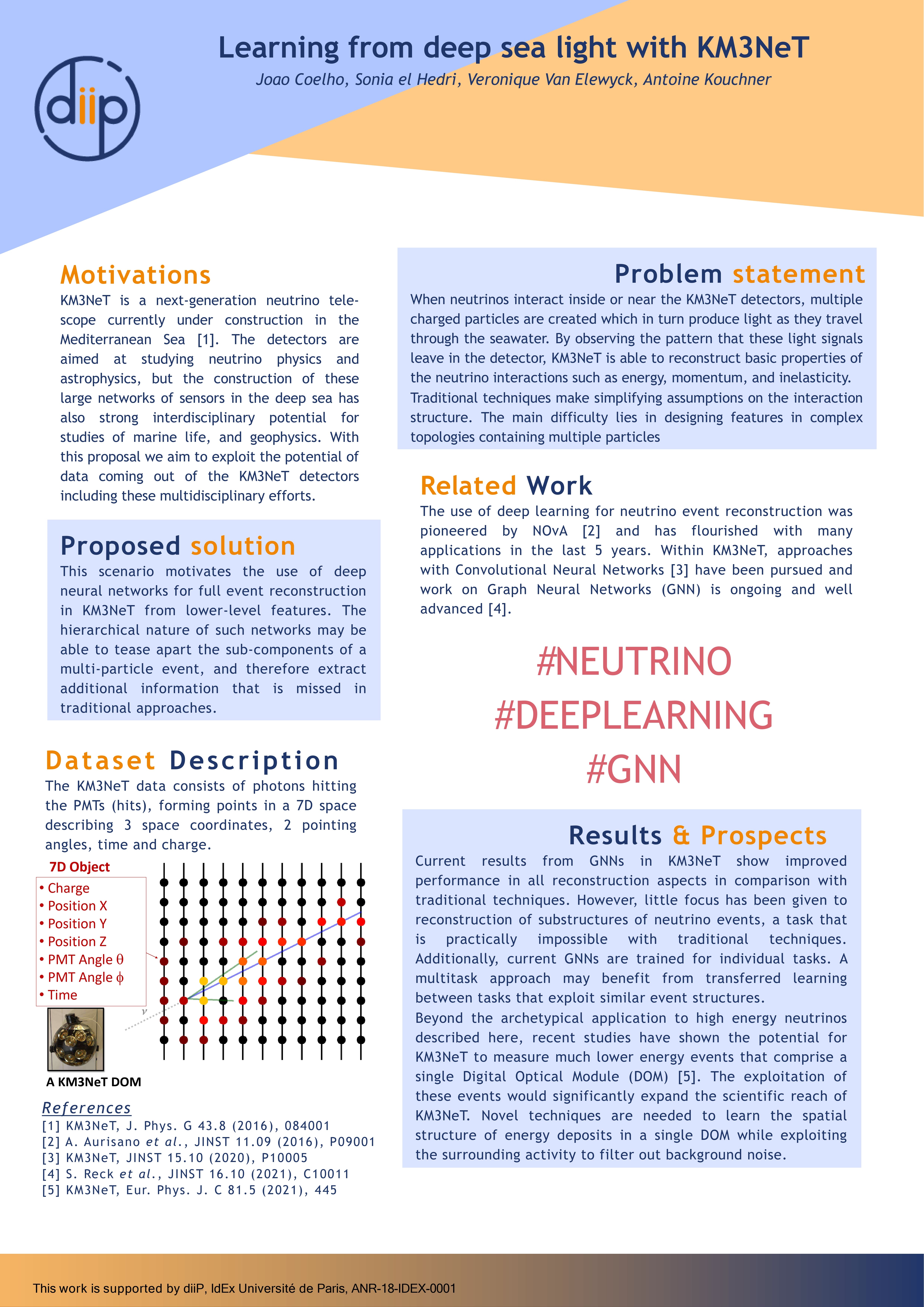 In the rare occasions when these neutrinos interact inside or near the KM3NeT detectors, multiple charged particles are created which in turn produce light as they travel through the seawater. By observing the pattern that these light signals leave in the detector, KM3NeT is able to reconstruct basic properties of the neutrino interactions such as energy, momentum, and flavour. Currently, these tasks are performed mostly by hand-crafted algorithms based on fundamental physics knowledge. The goal of this project is to enhance the capabilities of KM3NeT by exploring cutting-edge deep learning techniques to replace traditional reconstruction methods, pushing the boundaries of what is possible and enabling new areas of research with the KM3NeT infrastructure.