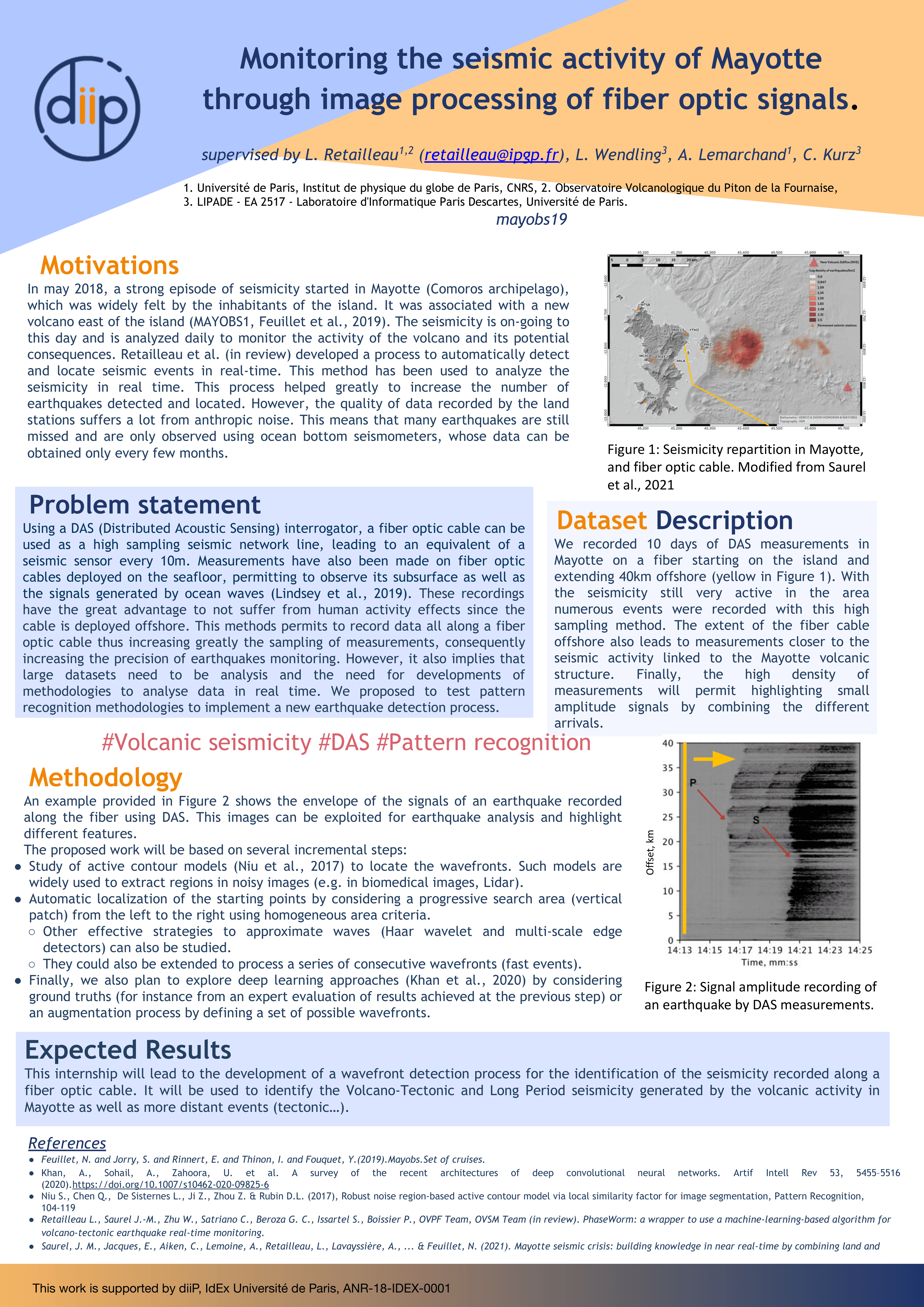 The seismicity in Mayotte is monitored daily using the seismic stations installed on the island. Retailleau et al. (under review) developed a process to automatically detect and locate seismic events in real-time. Using a neural-network-based method we identified the main waves (P and S) that are generated by an earthquake and then propagate through the earth and are recorded by the different seismic stations. The arrivals are then associated as an earthquake and are used to locate the event. This process helped greatly to increase the number of earthquakes detected and located. However, the quality of data recorded by the land stations suffers a lot from anthropic noise. In the last few years seismologists have increasingly used Distributed Acoustic Sensing (DAS) measurements. Using a DAS interrogator, a fiber optic cable can be used as a high sampling seismic network line, leading to an equivalent of a seismic sensor every 10m. Multiple studies showed that this data can be used in various contexts, to analyze seismic signals and to study the structure of the Earth (Zhan, 2020). On land, DAS recordings have been used to analyze Volcano-tectonic seismicity (Jousset et al., 2018) as well as anthropic signals (Lindsey et al., 2020). Measurements have also been made on fiber optic cables deployed on the seafloor, permitting to observe its subsurface as well as the signals generated by ocean waves (Lindsey et al., 2019). The proposed work will be based on several incremental steps: as a first step, we plan to consider active contour models (Niu et al., 2017) to locate the waves from a ground truth (approximate localization of P and S). Such models are widely used to extract regions in noisy images (e.g. in biomedical images, Lidar). They often required key points to initialize the fitting process near the region of interest (in this case the wavefront). We will choose these points from a polygonal approximation calculated on the given curves S and P. Secondly, we want to consider an automatic localization of the starting points by considering a progressive search area (vertical patch) from the left to the right using homogeneous area criteria. Due to the specificity of the wave – high density – we also propose to study two effective strategies to approximate waves (Haar wavelet and multi-scale edge detectors). The underlying idea is to provide a set of possible curves before running the active model process. Such methods could also be extended to process a series of consecutive wavefronts (fast events). Finally, we also plan to explore deep learning approaches (Khan et al., 2020) by considering ground truths (for instance from an expert evaluation of results achieved at the previous step) or an augmentation process by defining a set of possible wavefronts.