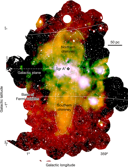 Tel un sablier géant de 500 années-lumière de long, deux gigantesques structures s’étendent de part et d’autre du plan galactique. Ces deux immenses « cheminées », laissent échapper du gaz très chaud vers l’espace, depuis le voisinage du trou noir supermassif Sagittarius A*, un astre très compact de 4 millions de masses solaires.