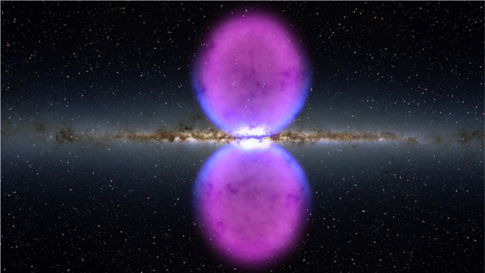 Image d’artiste des larges structures observées en rayons gamma par le satellite américain Fermi et nommées les « Fermi Bubbles » (couleur magenta) qui s’étalent de part et d’autre de la Voie Lactée, vue ici par la tranche dans son apparence en lumière visible (Crédit: NASA’s Goddard Space Flight Center).