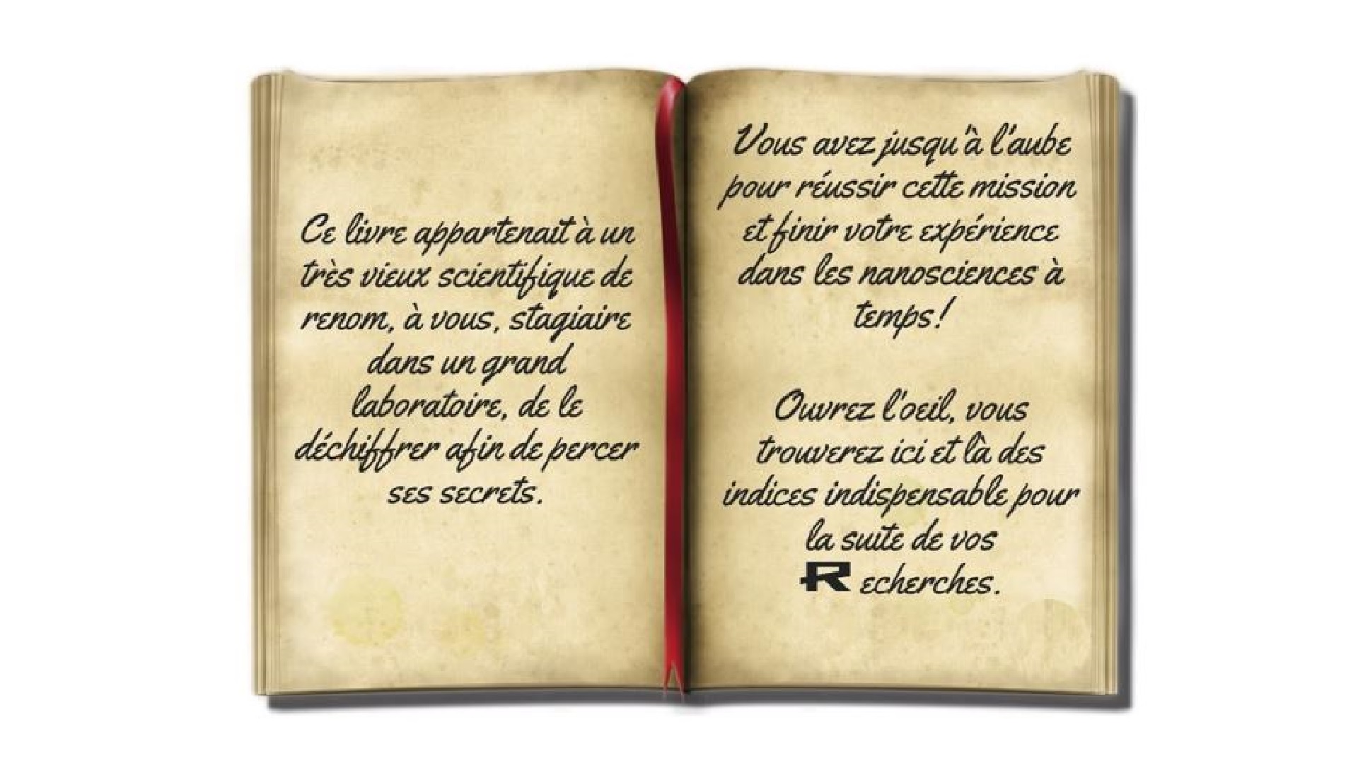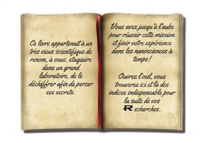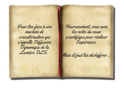 S’évader d’une de ces salles n’est pas aisée. Par chance, un vieux scientifique de renom a laissé son manuscrit aux élèves de l’EIDD et aux aventuriers venus affronter cet escape game. Dans la peau de stagiaires d’un grand laboratoire, ces aventuriers trouveront-ils les codes de sortie de la DRX, de l’ICPMS ou encore de la DLS. Sortiront-ils indemnes de ces salles ?
