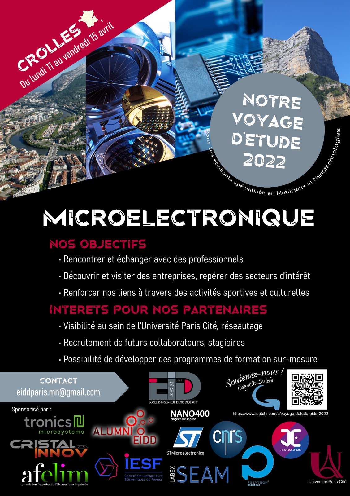Les élèves ingénieurs de l’école EIDD organisent un voyage d’étude à Grenoble-Crolles de 5 jours autour de la thématique de la microélectronique. Ce voyage prévoit la visite de sites industriels du secteur de la microélectronique et de l’école Polytechnique de Grenoble.