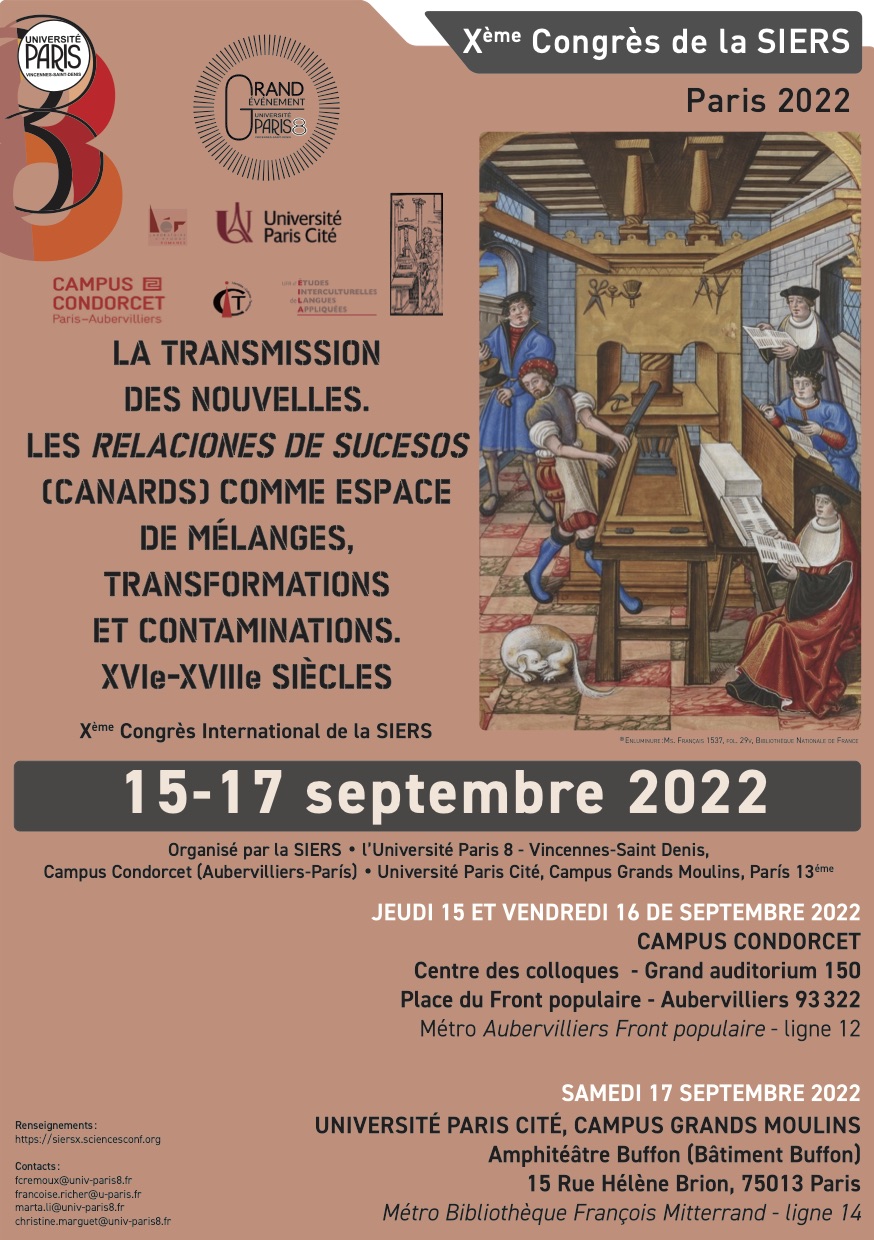 Colloque international organisé par la SIERS (Sociedad Internacional para el Estudio de las Relaciones de Sucesos), l’Université Paris 8 Vincennes – Saint-Denis (Laboratoire d’Etudes Romanes), le Campus Condorcet et Université Paris Cité (Laboratoire ICT et UFR EILA).