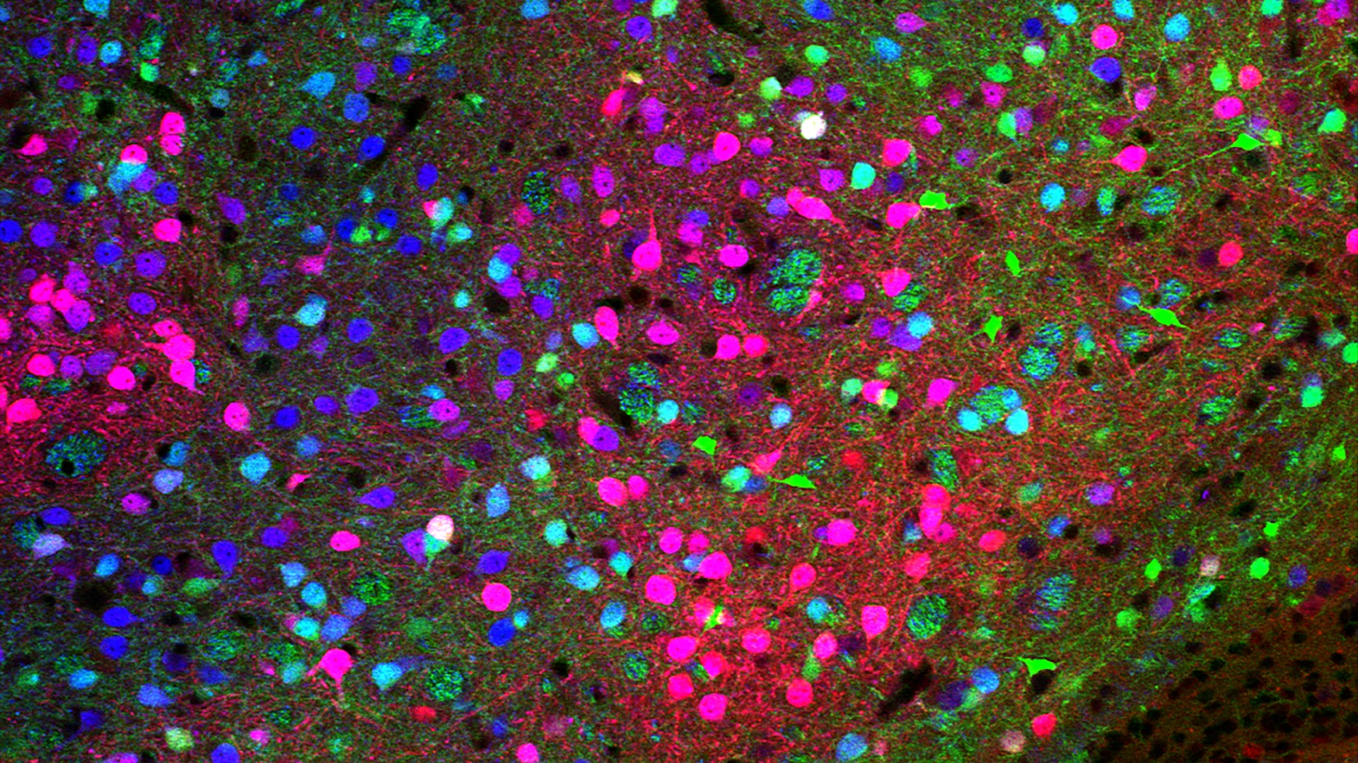 Confocal microscopy image showing a region of the nucleus accumbens, a brain structure that is part of the dopamine circuit and highly involved in reward processes.