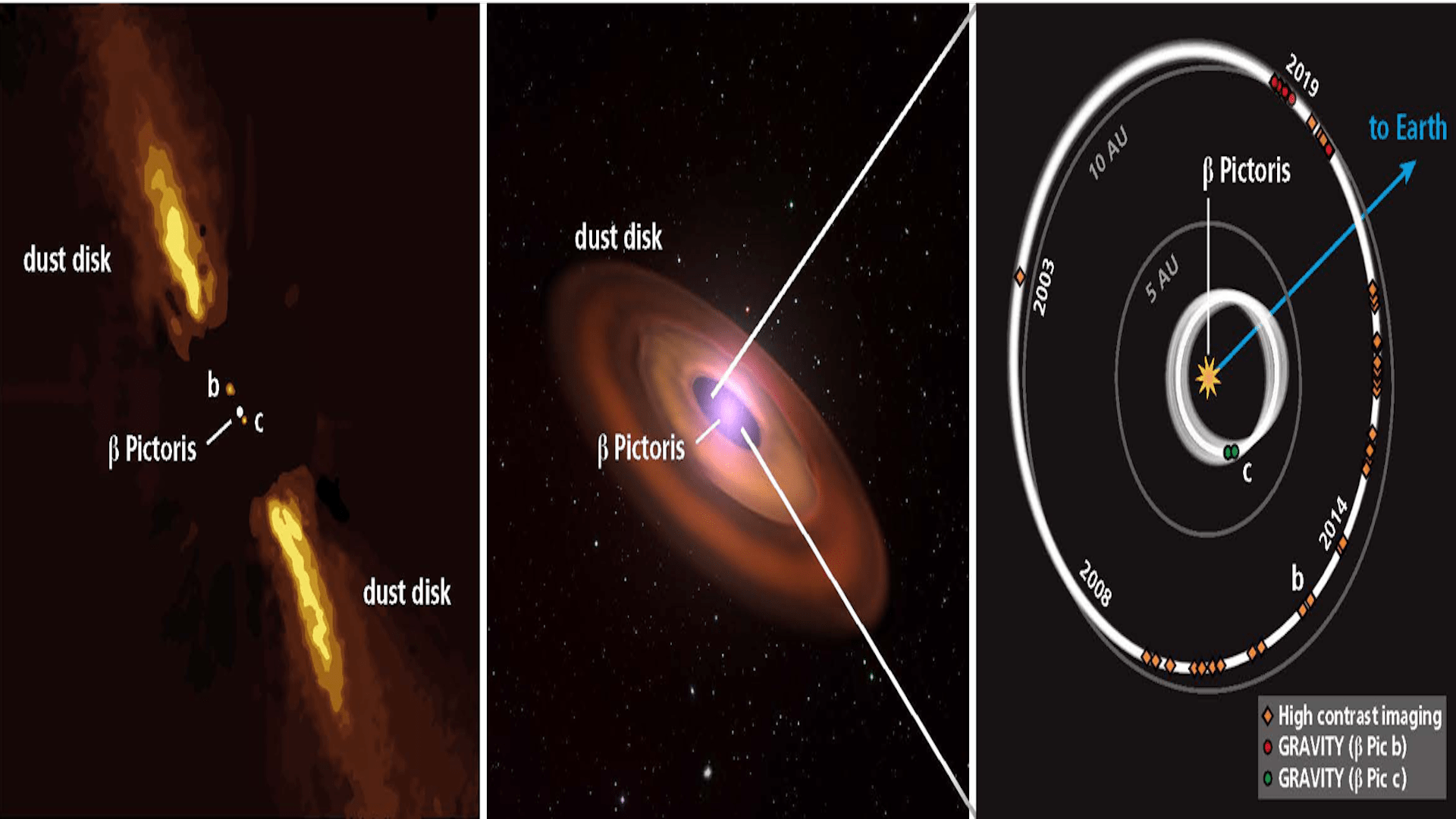Images synthétiques du système planétaire beta Pictoris. A gauche et au centre, vue du système avec l’étoile et son disque de poussières. Les orbites des deux planètes sont représentées, vue du dessus dans l’image de droite.