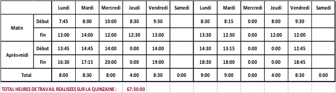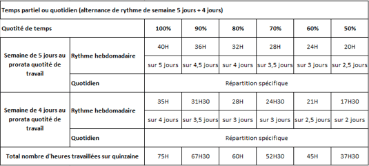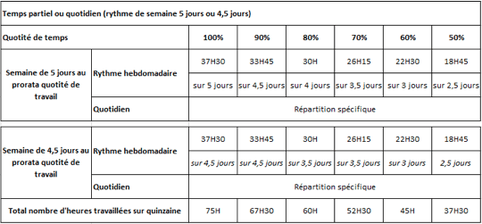 - pour le rythme 4.5 jours + 4.5 jours : entre 8h et 9h de travail effectif journalier et entre 3h00 et 4h00 de travail effectif sur la demi-journée OU entre 8h10 et 9h10 de travail effectif journalier et entre 3h40 et 4h40 de travail effectif sur la demi-journée.