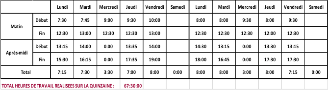 Dans cet exemple, l’agent effectue en moyenne 7h30 avec plus ou moins 30 minutes par jour, soit entre 7h et 8h par jour de sorte à faire 75 heures dans la quinzaine. Ses plages horaires peuvent lui permettre de mieux concilier vie professionnelle et vie personnelle tout en respectant le cadre général qui implique une présence obligatoire entre 10h et 15h30 ainsi qu’une pause méridienne d’au moins 45 minutes.