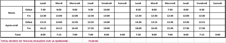 - un agent ayant un rythme de travail 5+5 jours devra travailler en moyenne 7h30 par jour, avec une durée minimale journalière de 7h et une durée maximale journalière de 8h, de sorte qu’il ait accompli 75 heures de travail effectif à la fin de la quinzaine de référence.