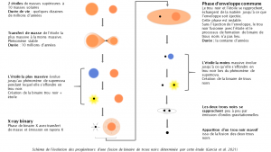 Tout commence avec deux étoiles, souvent massives (d’une masse supérieure à 10 masses solaires), qui naissent dans le même nuage interstellaire. Au cours de leur vie de couple, la plus massive transfère de la matière à la moins massive et finit par s’effondrer, implosant en supernova en formant le premier trou noir. Ce dernier et la seconde étoile vont alors s’échanger de nouveau de la matière, avant que la seconde étoile grossisse au point que son enveloppe immerge l’ensemble du système trou noir + étoile. Cette phase, dite d’enveloppe commune, dure environ une centaine d’années. Peu à peu, le trou noir, freiné par cette enveloppe commune de gaz, se rapproche de la seconde étoile, jusqu’à l’éjection de l’enveloppe. La seconde étoile finit par imploser en supernova, s’effondrant à son tour en trou noir. Pendant 1 milliard d’années environ, les deux trous noirs gravitent l’un autour de l’autre, jusqu’au moment où ils fusionnent, en émettant des ondes gravitationnelles détectables[1] par les interféromètres LIGO-Virgo.