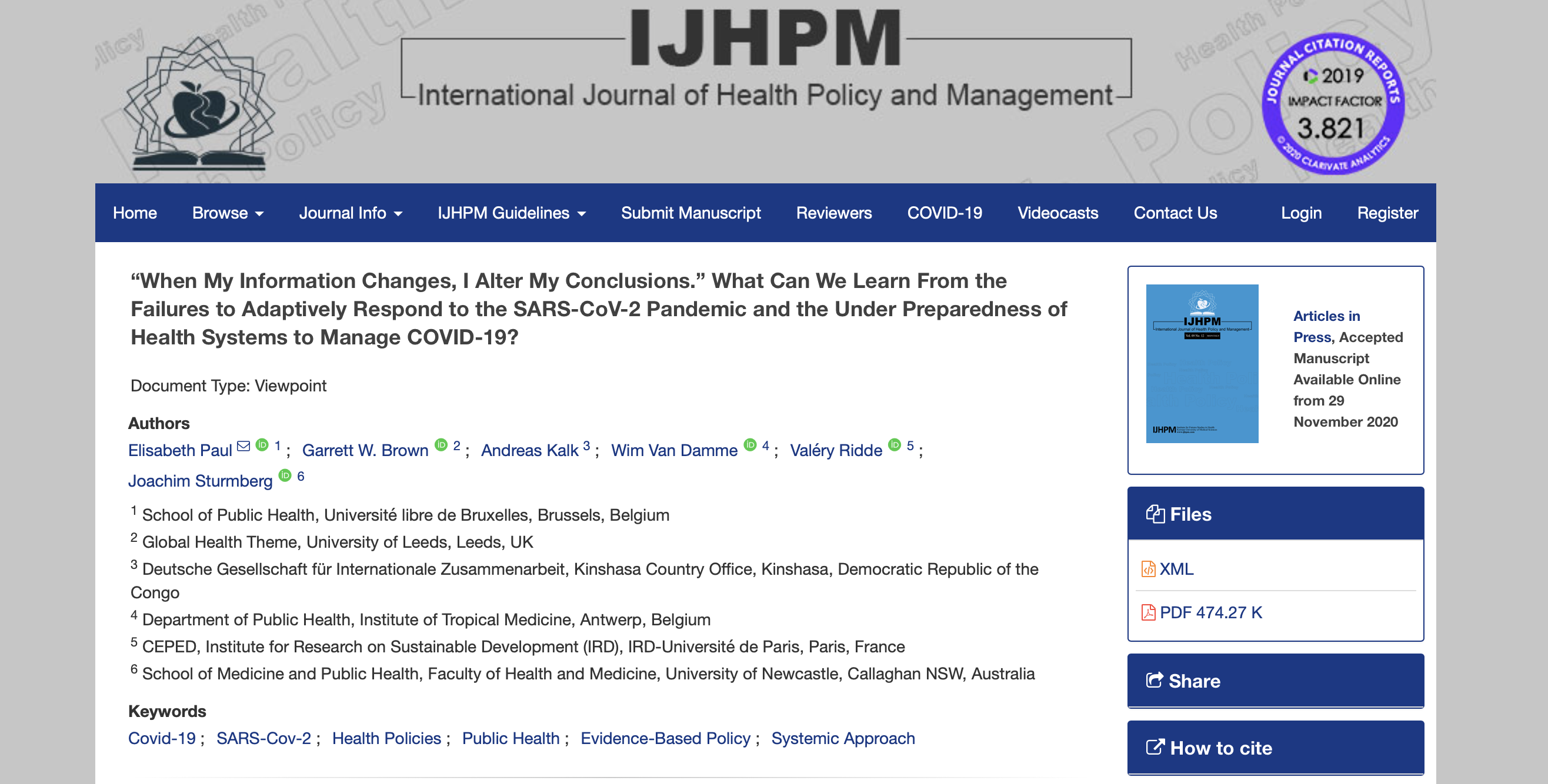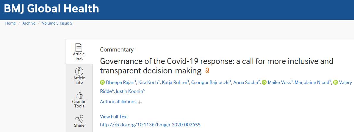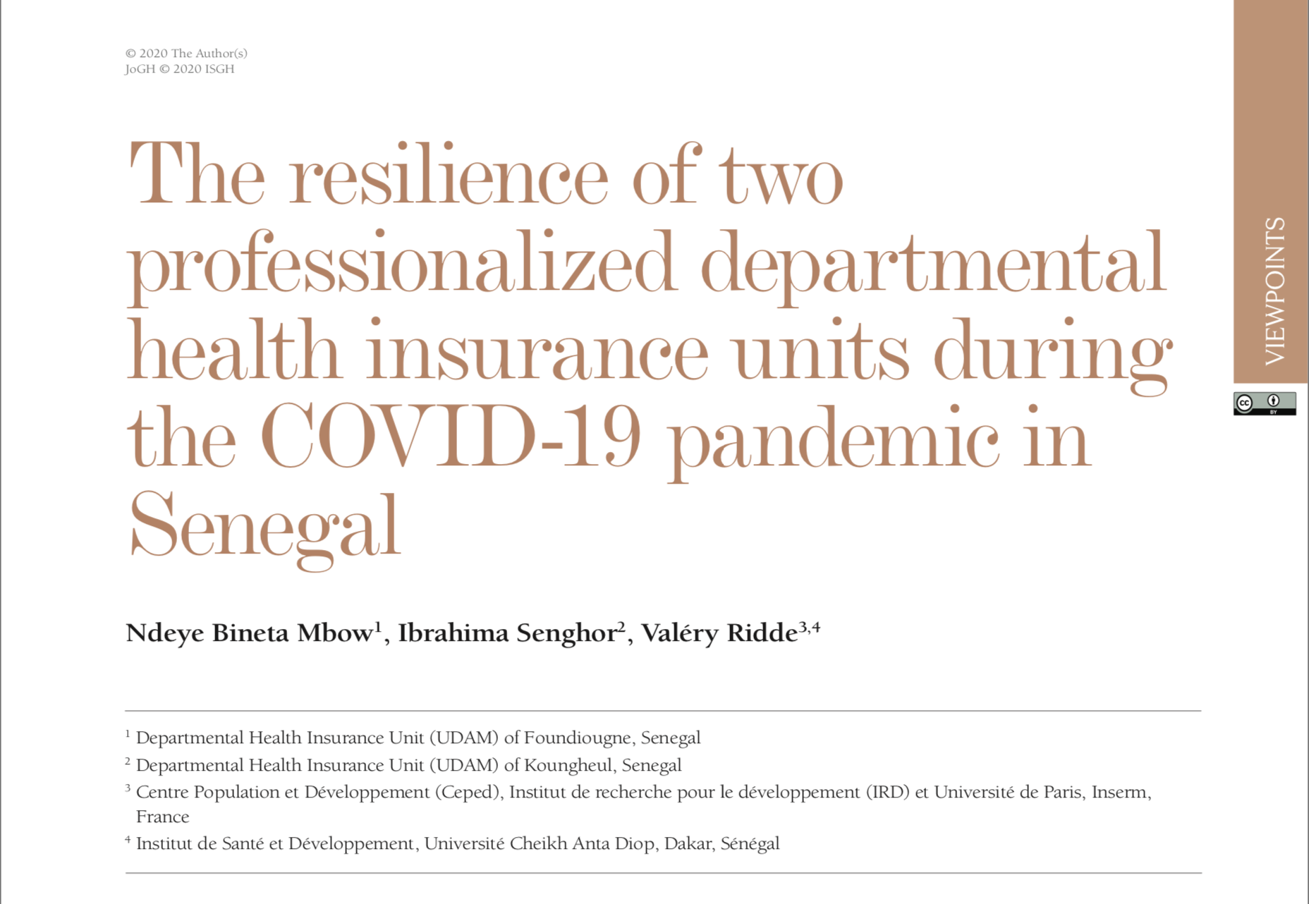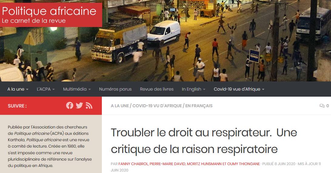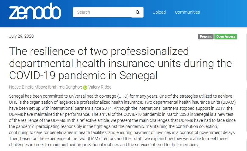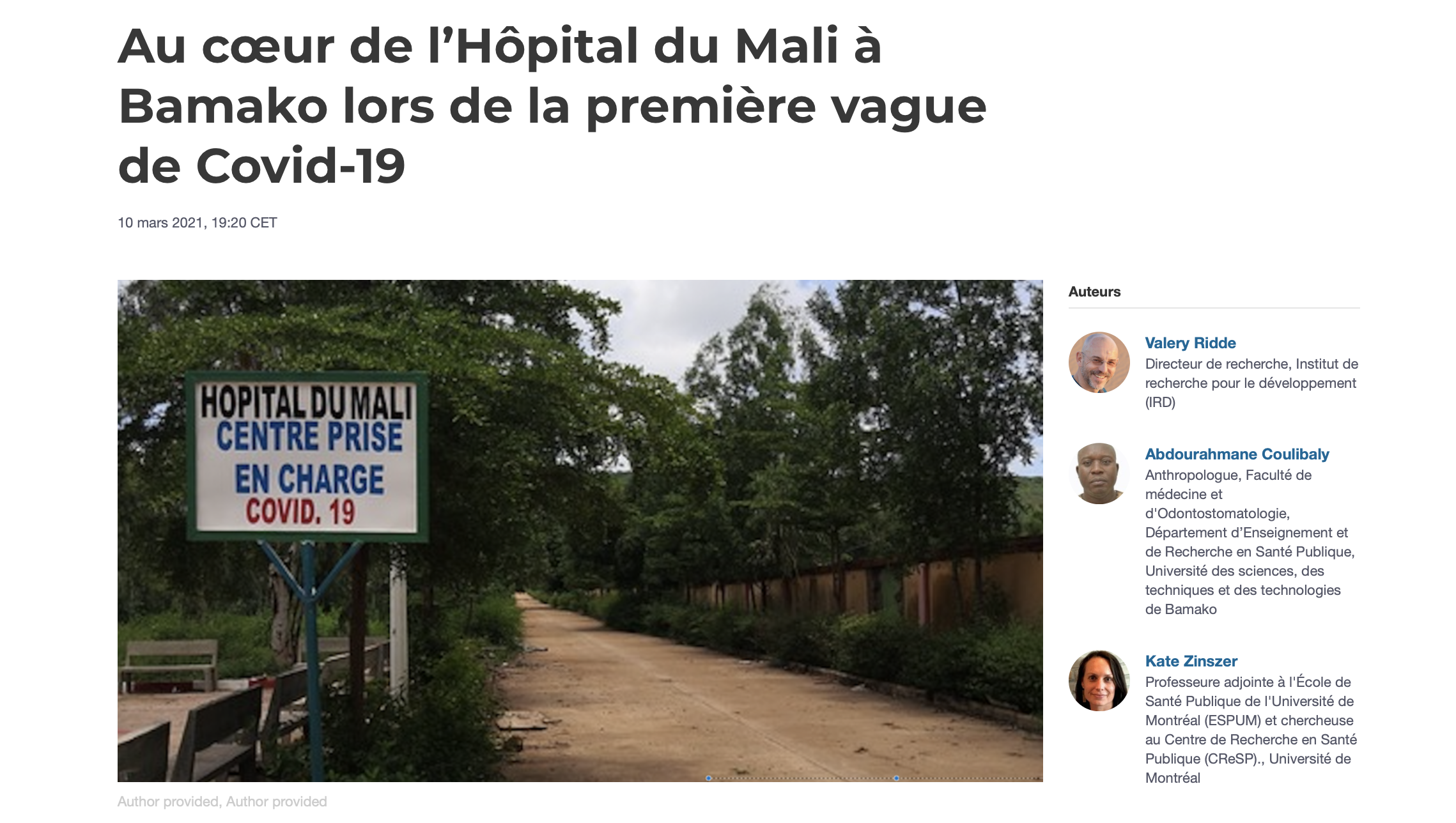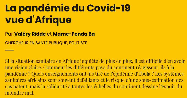 HoSPiCOVID in the news HoSPiCOVID project in the news Press articles On the resilience of hospital and public health staff facing COVID-19 in Quebec: did we reach a breaking point? La riposte nationale contre la COVID-19 au Sénégal : de la formulation à sa mise en œuvre Qu’ont fait les hôpitaux chinois lors de la pandémie de Covid-19 ? Résilience des organisations vs résilience du bâti ? Au cœur de l’Hôpital du Mali à Bamako lors de la première vague de Covid-19 “When My Information Changes, I Alter My Conclusions.” What Can We Learn From the Failures to Adaptively Respond to the SARS-CoV-2 Pandemic and the Under Preparedness of Health Systems to Manage COVID-19? The resilience of two professionalized departmental health insurance units during the COVID-19 pandemic in Senegal FIOCRUZ : sete décadas de respostas a epidemias Sénégal : un modèle d’assurance santé résilient en temps de Covid-19 Les hôpitaux ont besoin d’espaces pour respirer The COVID-19 Pandemic in Francophone West Africa: From the First Cases to Responses in Seven Countries The resilience of two professionalized departmental health insurance units during the COVID-19 pandemic in Senegal Santé publique : pour l’empowerment plutôt que l’infantilisation Governance of the Covid-19 response: a call for more inclusive and transparent decision-making COVID-19: time for paradigm shift in the nexus between local, national and global health Troubler le droit au respirateur. Une critique de la raison respiratoire La pandémie du Covid-19 vue d’Afrique Blogs & websites of interest Blogs : Mediapart – Valery Ridde’s blog Websites : COVID-19 Afrique COVID-19 project in Brazil