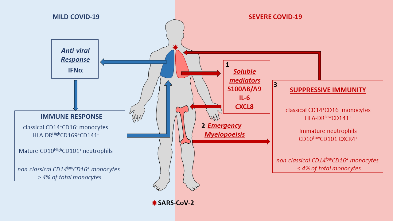 De multiples analyses des cellules sanguines de ces patients, notamment par cytométrie spectrale en flux, ont révélé des modifications de la production et de la répartition de certaines cellules myéloïdes du système immunitaire chez les patients atteints d’une forme grave de la Covid-19, aboutissant à une immunosuppression. Ces modifications incluent :