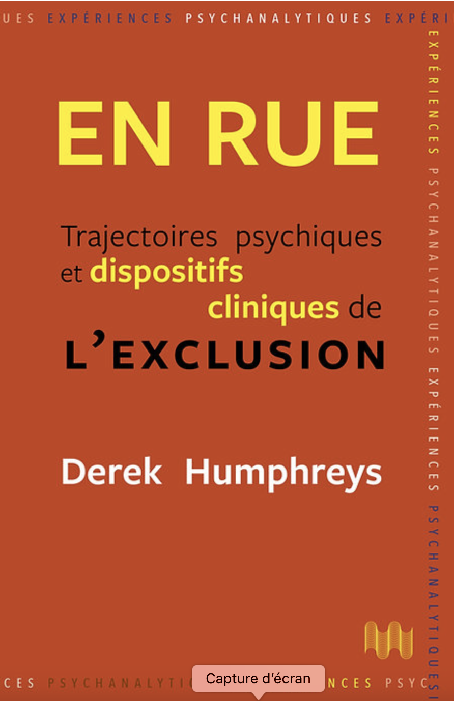 L’ouvrage rend compte de l’expérience de psychologues et de psychanalystes qui vont à la rencontre de la population qui vit dans la rue, en Ile-de-France ; leur but est de créer et d’offrir aux personnes exclues un dispositif clinique adapté à leur situation, en prenant en compte la problématique de la santé mentale dans les conditions de précarité et d’exclusion sociale.