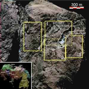 Étant illuminée pendant le passage du périhélie, quand le flux solaire est le plus intense, Anhur est une des régions les plus érodées, avec une structure géomorphologique en forme de canyon qui expose les couches les plus primordiales et les moins altérées de la comète (Fig. 2).