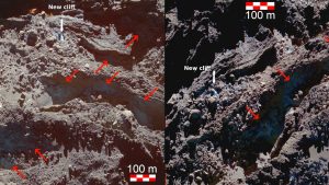 Autres changements identifiés sur la comète concernent l’amincissement de la couche de poussière, le déplacement et la fragmentation de quelque rocher, ainsi que l’apparition de deux nouveaux escarpements, un de 140m de longueur et 10 m de hauteur et l’autre d’environ 30m de longueur et 12m de hauteur. La perte de masse totale associée aux changements morphologiques produits par l’activité sur la région Anhur est de 50 millions de kg, c’est-à-dire plus de 0,5% de la masse totale perdue par la comète pendant les 2 ans d’observations de Rosetta. A la base de deux nouveaux escarpements, de la glace d’eau a été observée sur plus de 6 mois, et avec une abondance estimée à 27%. Dans les images à haute résolution spatiale (8-30 cm/pixel) acquises à la fin de la mission et quand la comète était à 3.4 UA de distance du Soleil, plusieurs points brillants contenant de la glace d’eau ont été observés, ainsi que une couche mince de givre qui condense dans les régions à l’ombre d’Anhur (Fig. 3), comme dans la structure en forme de canyon. Ceci prouve que la glace est abondante juste en-dessous de la couche de poussière sombre qui couvre la surface cométaire.
