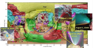Figure 1 : Carte avec la position de jets et sursauts d’activité identifiés sur les différentes régions de la comète 67P. Quelques jets spectaculaires sont montrés, notamment le sursaut d’activité du 12 août 2015 (en bas à droite), qui représente un des phénomènes d’activité parmi les plus intenses observés par Rosetta sur la comète 67P.