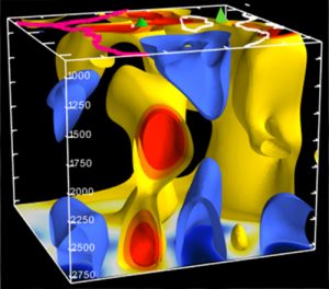 Modélisation 3D, en tomographie par inversion de forme d’onde, des points chauds de la Réunion et des Comores, depuis la limite noyau-manteau jusqu’à 850 km de profondeur. Les couleurs jaune et bleue, indiquent les contours des zones de perturbations relatives des vitesse sismiques, de -1% et +1%, respectivement. Ce modèle révèle la présence de trois conduits distincts de faible vitesse sismique dans le manteau inférieur.
