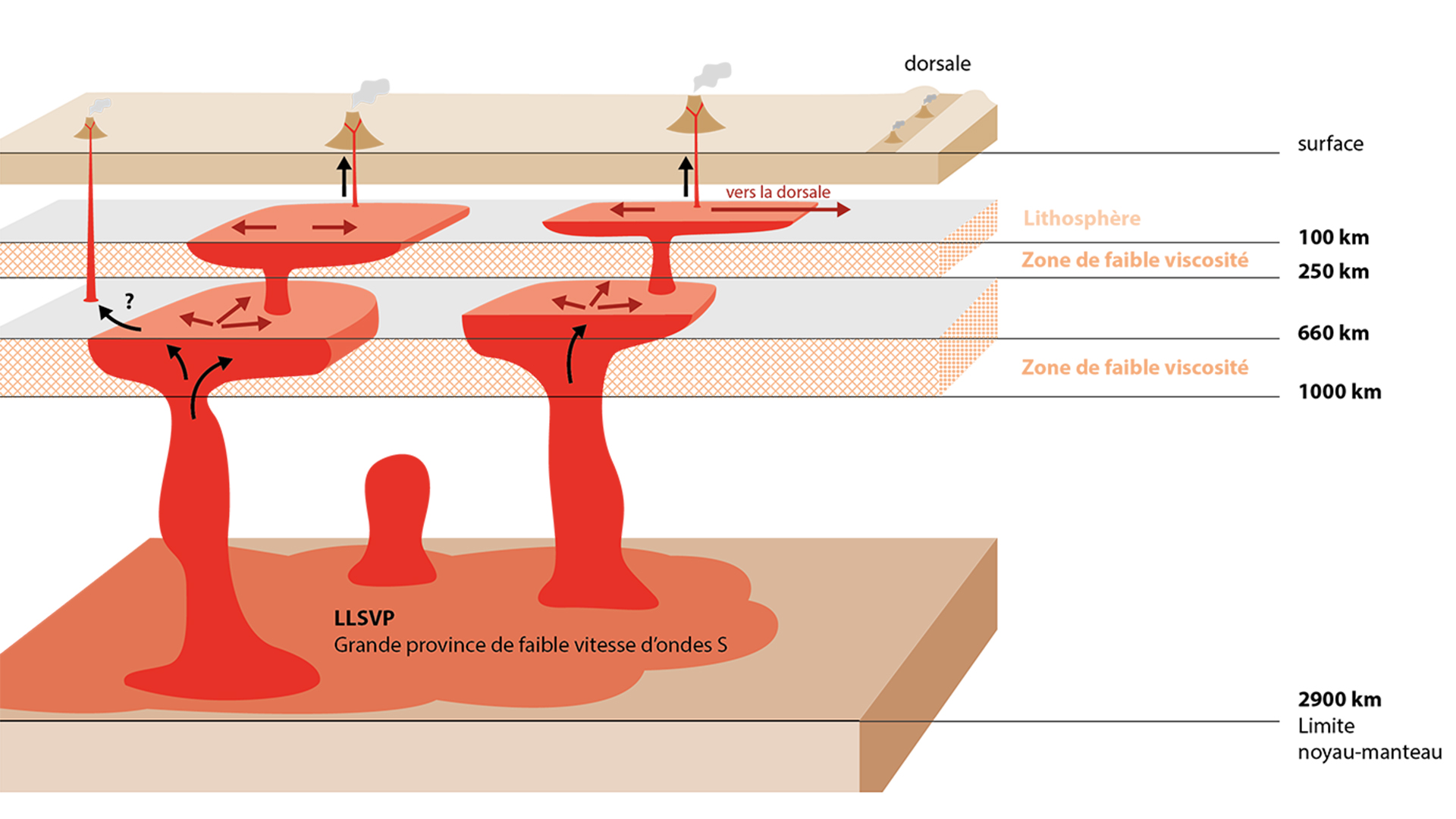 Grâce aux récentes imageries par tomographie sismique globale, il est désormais communément admis que les deux super-panaches mantelliques, africain et pacifique, prennent racine à la limite noyau manteau à 2900km de profondeur et remontent à travers le manteau jusqu’au voisinage des principaux points chauds de la planète. Mais le détail de ces structures profondes (LLSVP, large low-shear velocity provinces, pour grandes provinces de faible vitesse d’ondes S) à l’origine des éruptions des volcans de points chauds, comme le Piton de la Fournaise à La Réunion ou les volcans de l’archipel d’Hawaii, mais aussi de l’ouverture de la Pangée ou de la mise en place cataclysmique des traps volcaniques il y a plusieurs dizaines de millions d’années, reste sujet à débats, entre des modèles de grande structure compacte s’étendant sur des milliers de kilomètres ou d’un ensemble de panaches mantelliques distincts.