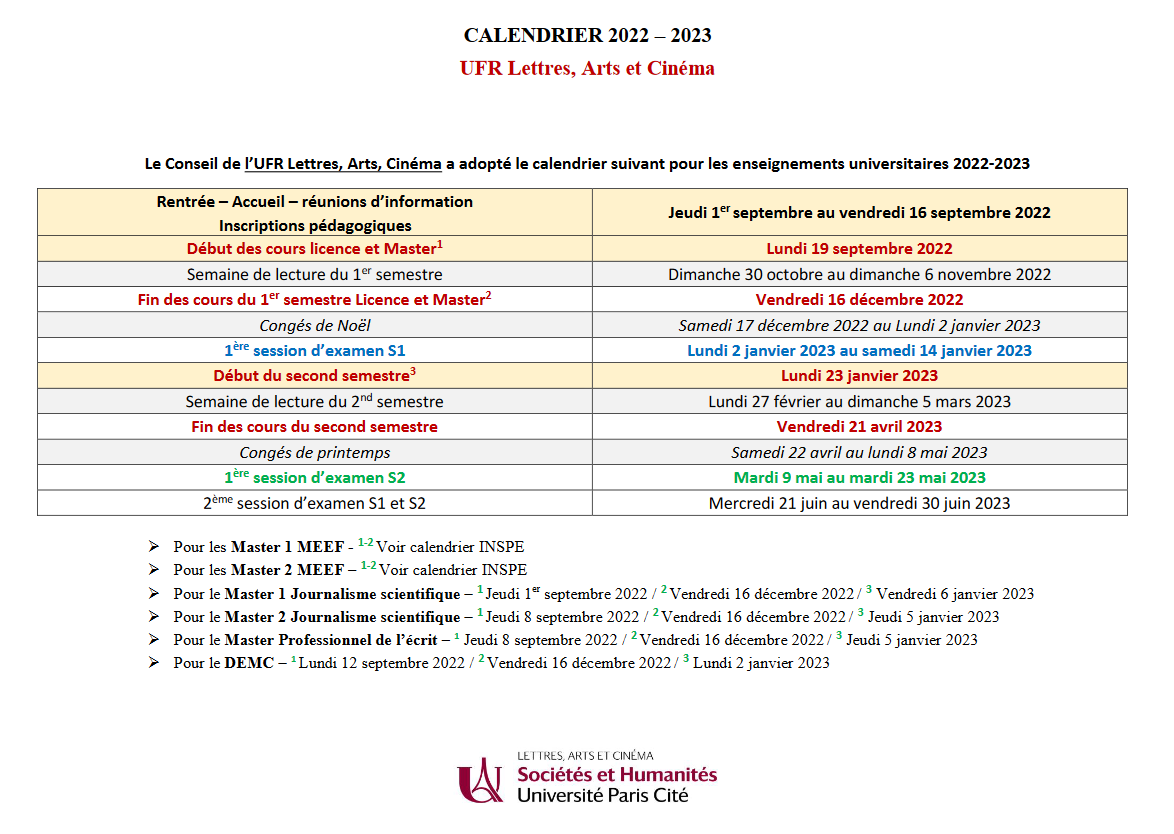 Calendrier UFR LAC 2022-23