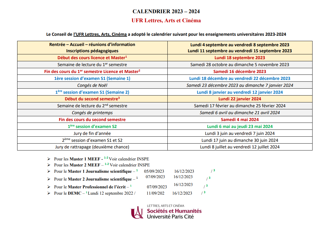 Calendrier UFR LAC 2023-24