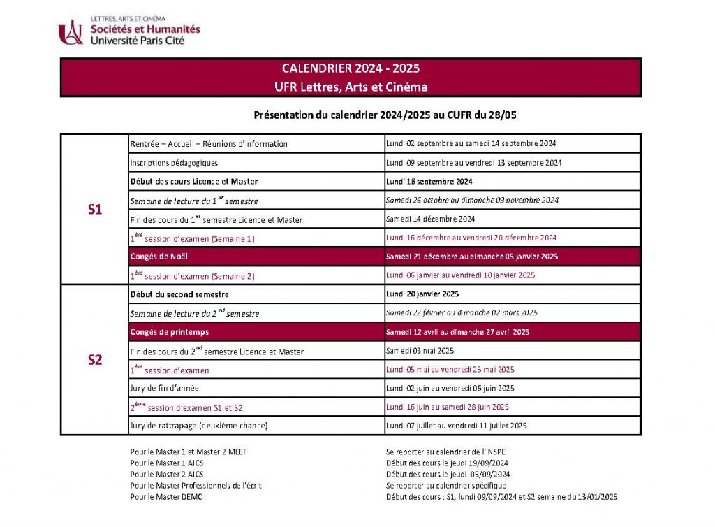 Calendrier UFR LAC 2024-25