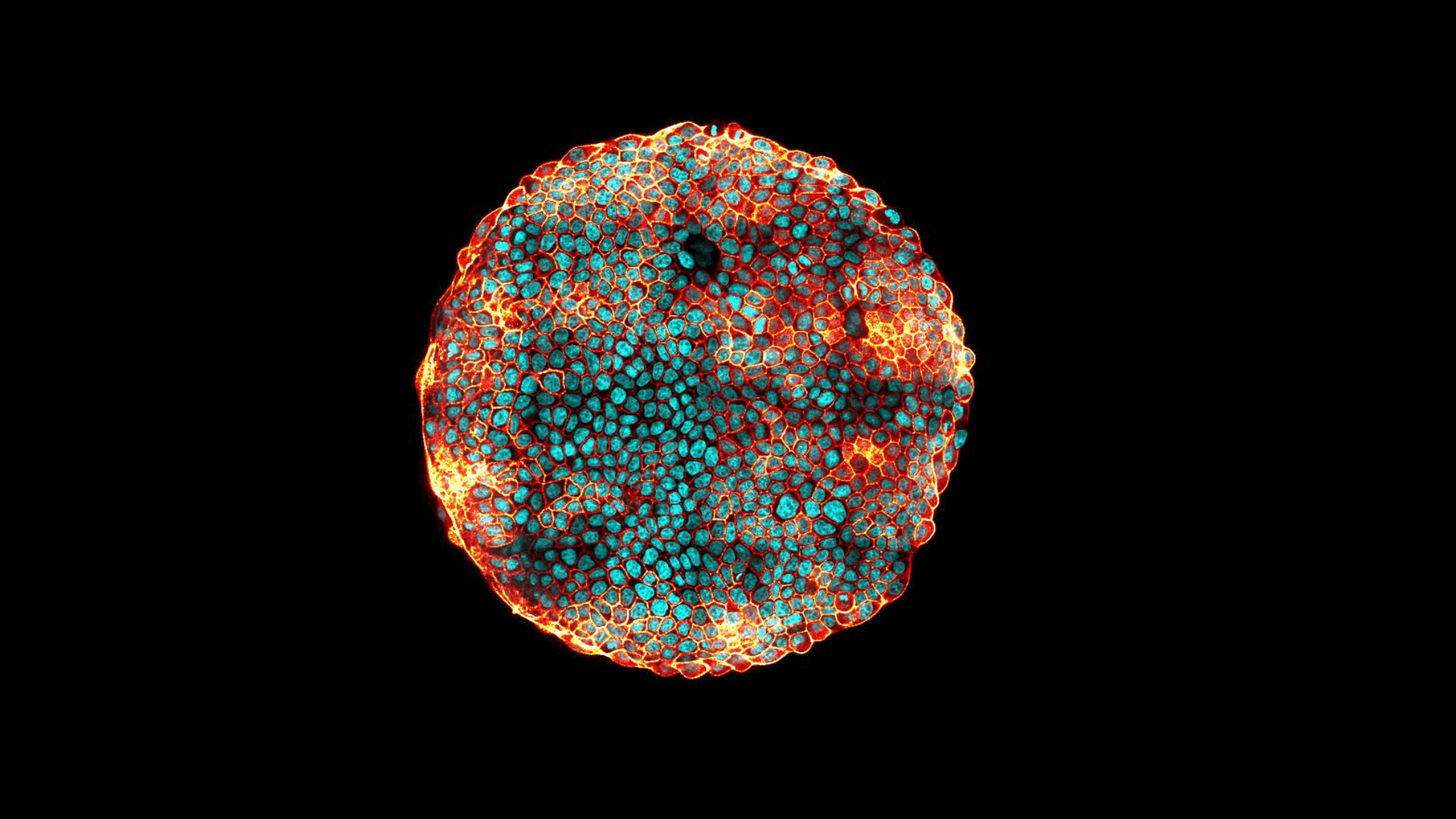 Légende : Des cellules épithéliales (ici provenant d’un rein de chien) ont été mises en culture sur un gel de polyacrylamide présentant une particularité : on y a disposé des disques de protéine d’adhérence à certains endroits et transformé la surface pour la rendre peu adhésive partout ailleurs. On voit alors que la colonie de cellules n’envahit pas tout l’espace comme c’est le cas normalement mais se restreint parfaitement au contour du disque de protéines. Sur l’image les noyaux des cellules sont de couleur cyan et les contours des cellules sont dans une nuance de jaune-rouge. Cette image a été prise grâce à la microscopie confocale à fluorescence qui permet de visualiser différents constituants des cellules sur des images indépendantes. Ici l’image des noyaux des cellules a été combinée à l’image des contours des cellules.