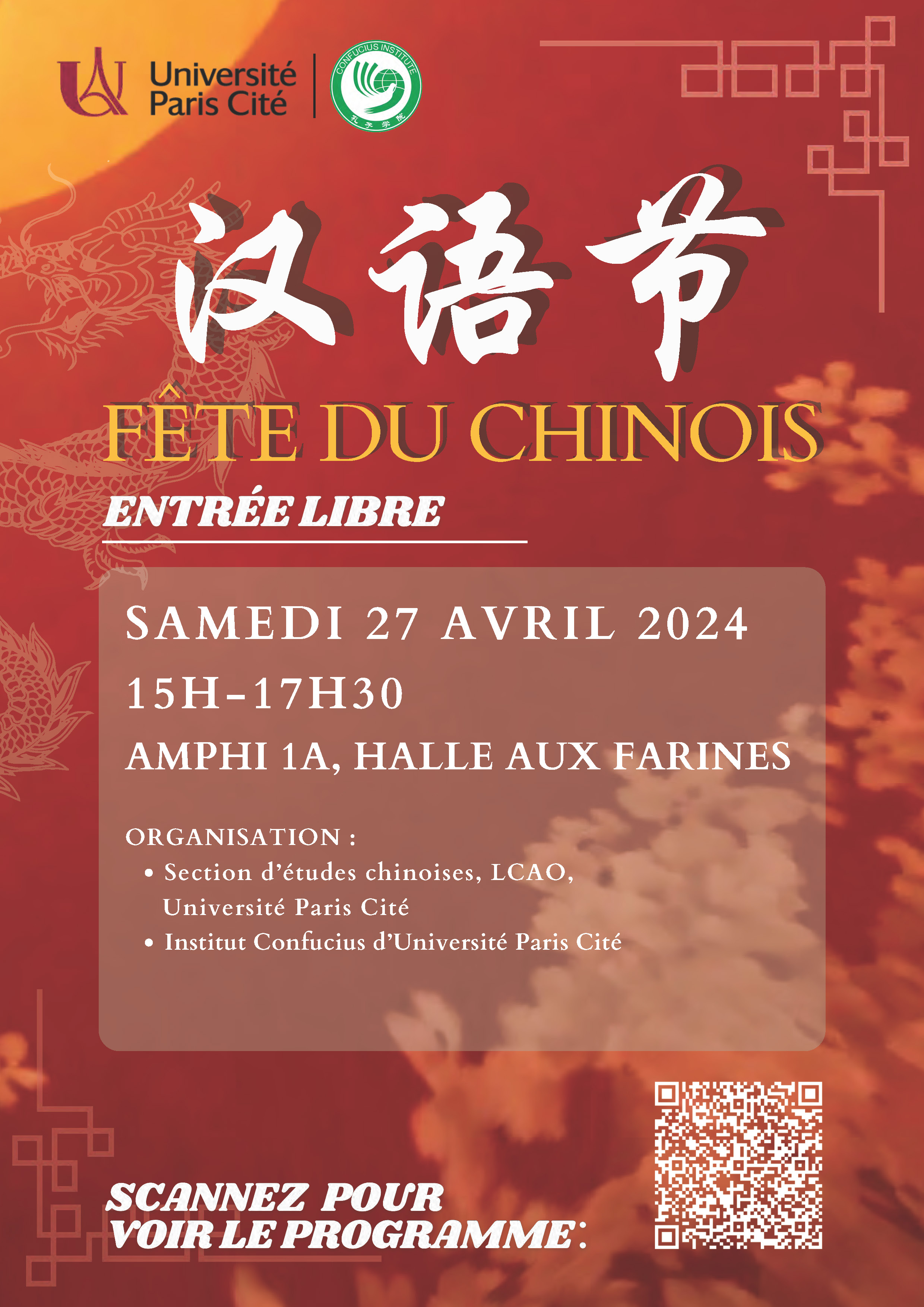 La section des études chinoises de l’UFR LCAO et l’Institut Confucius d’Université Paris Cité organisent le samedi 27 avril la fête du nouvel an chinois, Amphi 1A (bâtiment Halle aux farines) à partir de 15h00.