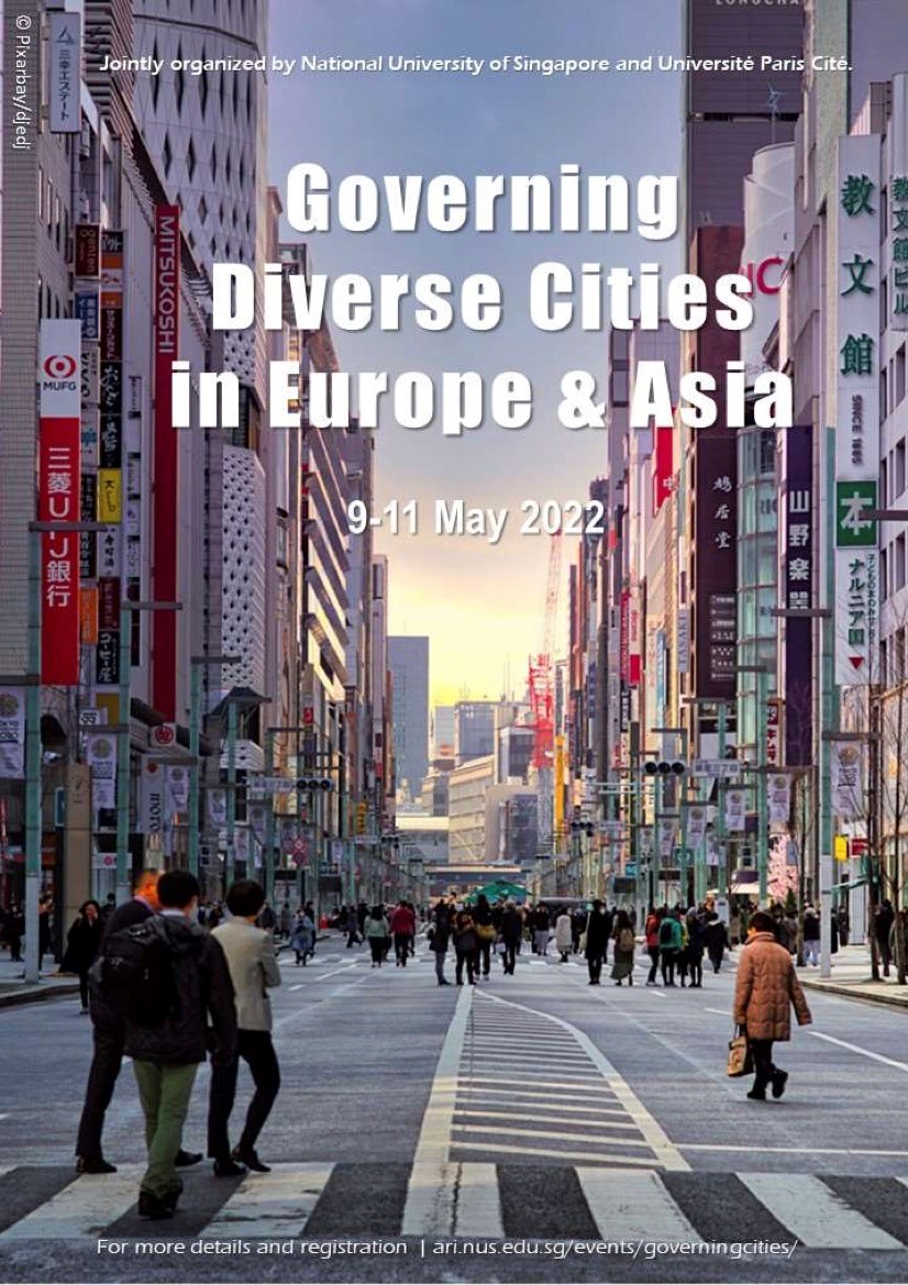 9-11 Mai 2022, conférence hybride à la National University of Singapore (NUS) et en ligne. Co-organisée par NUS et UPC, dans le cadre du programme de recherche Idex « Governing Diverse Cities in Europe and Asia » co-porté par Marie Gibert-Flutre, Jémérie Molho, Kong Chong Ho, Camille Schmoll et Delphine Pagès El-Karoui