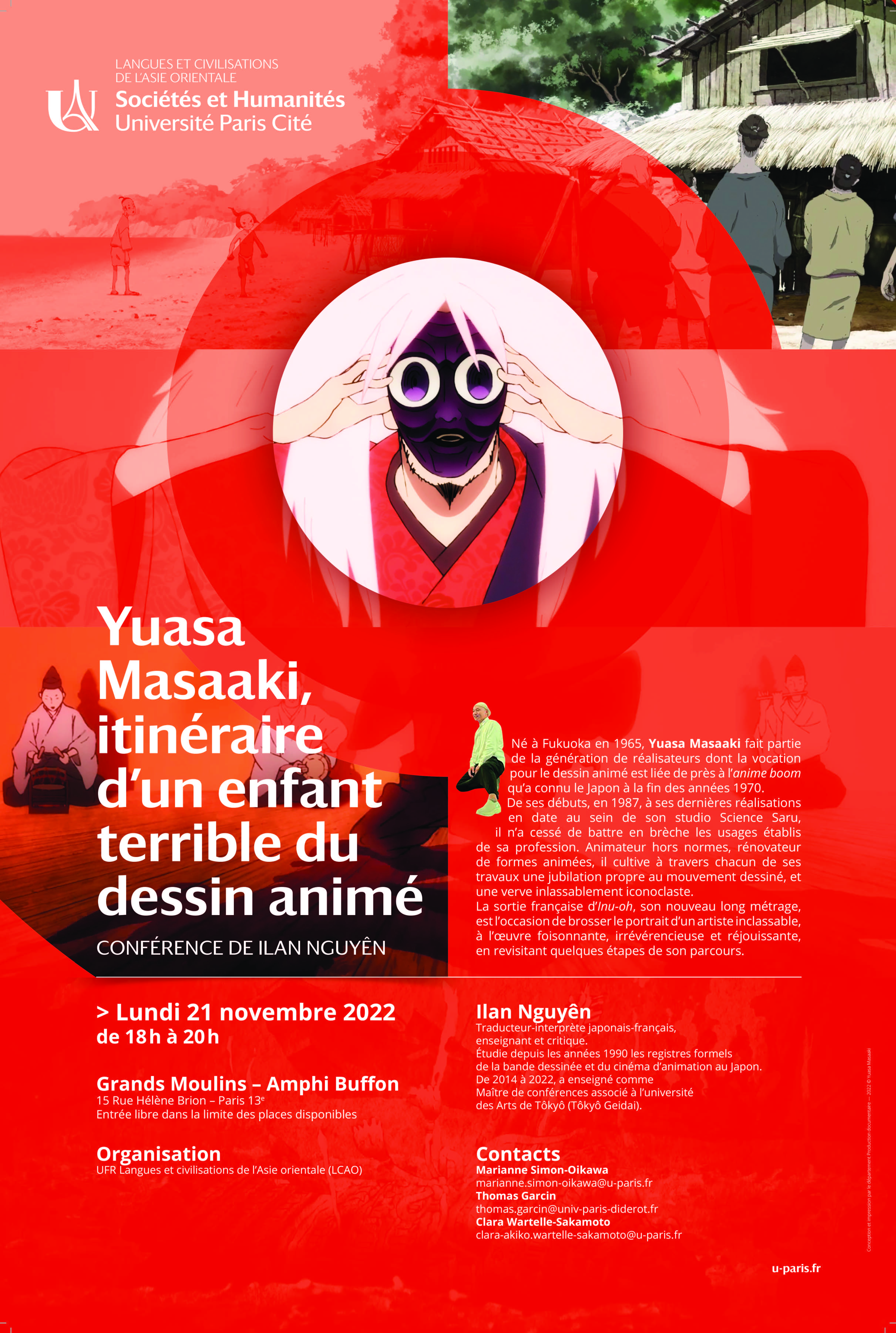 Né à Fukuoka en 1965, Yuasa Masaaki fait partie de la génération de réalisateurs dont la vocation pour le dessin animé est liée de près à l’anime boom qu’a connu le Japon à la fin des années 1970. De ses débuts, en 1987, à ses dernières réalisations en date au sein de son studio Science Saru, il n’a cessé de battre en brèche les usages établis de sa profession. Animateur hors normes, rénovateur de formes animées, il cultive à travers chacun de ses travaux une jubilation propre au mouvement dessiné, et une verve inlassablement iconoclaste. La sortie française d’Inu-oh, son nouveau long métrage, est l’occasion de brosser le portrait d’un artiste inclassable, à l’œuvre foisonnante, irrévérencieuse et réjouissante, en revisitant quelques étapes de son parcours. Sauvegarder et quitter