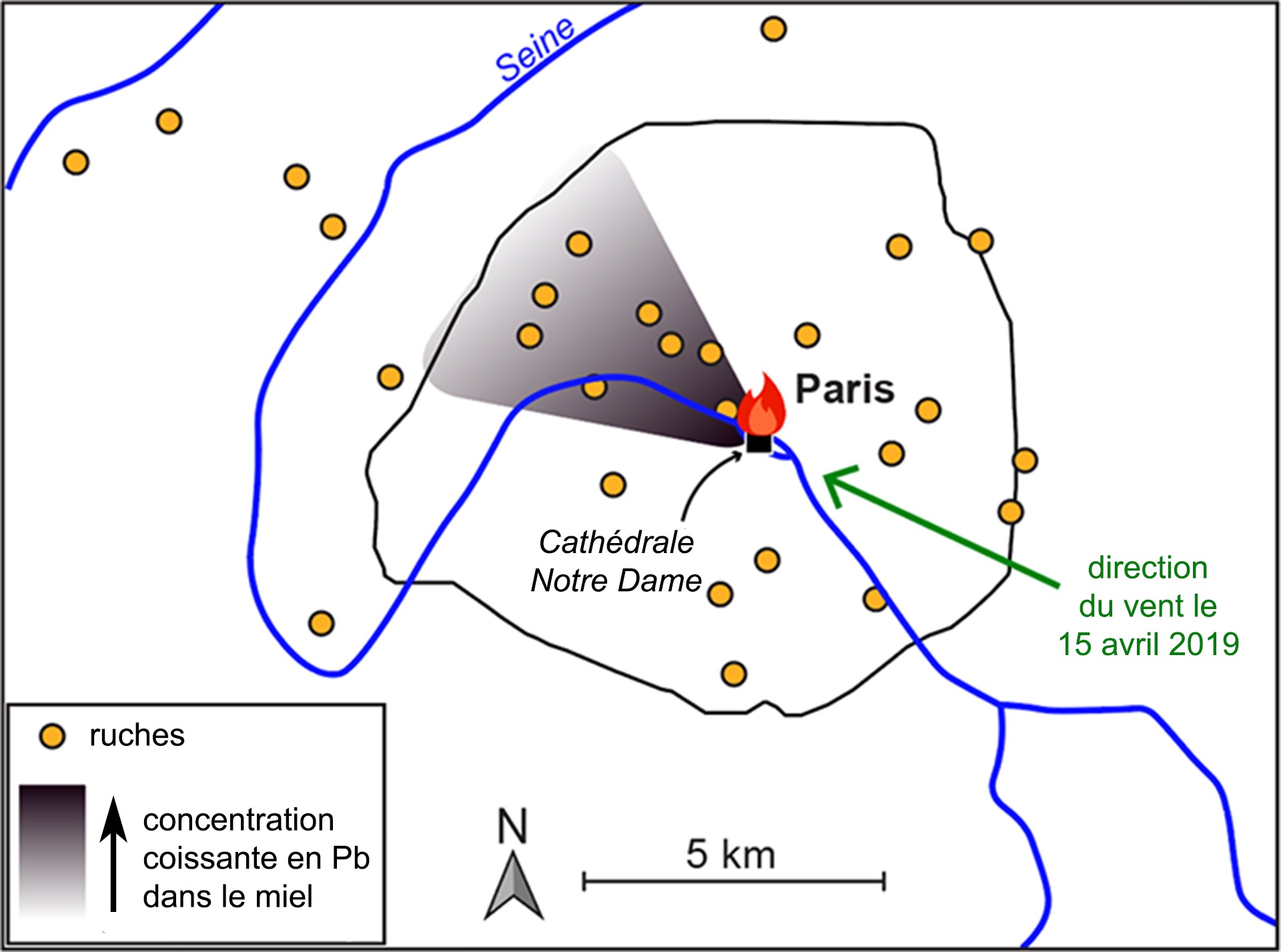 Pour estimer la distribution de ces retombées de plomb (Pb), des scientifiques de l’université de Colombie-Britannique (Canada), du CNRS à l’Institut de physique du globe de Paris – Université Paris Cité et de Beeopic, ont comparé des échantillons de miel collectés dans des ruches d’Île de France avant et après l’incendie et dans des ruches de la région Rhône-Alpes. Les abeilles, qui butinent dans un rayon maximum de 2 à 3 km de leur ruche, amoncellent aussi les poussières environnantes et leurs miels sont ainsi représentatifs de la présence de métaux dans leurs environnement. En mesurant les concentrations de différents métaux et les rapports isotopiques du plomb dans ces échantillons, l’étude, publiée le 20 juillet dans la revue Environmental Science & Technology Letters, observe que le miel provenant de ruches sous le vent le soir de l’incendie présente des concentrations en plomb plus élevées que les autres miels (sans toutefois dépasser les seuils des normes de consommation en vigueur). Ces concentrations décroissent avec l’éloignement des ruches du lieu de l’incendie.