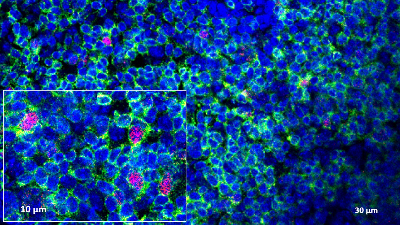 Visualisation de la prolifération des cellules immunitaires (lymphocytes) dans les ganglions mésentériques sous l’influence du microbiote modulé par le régime gras.