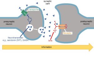 Dans le cerveau, les informations sont transportées par les neurones sous forme de signaux électriques qui se propagent le long des axones jusqu’à leur extrémité constituée de dendrites. Pour passer d’un neurone à l’autre, l’information doit sortir du 1er neurone pour entrer dans le 2e en traversant la synapse, zone d’influence entre neurones qui ne se touchent pas. Le signal électrique doit donc être transformé en message chimique. L’arrivée du signal électrique au niveau des dendrites provoque la libération par le 1er neurone de molécules appelées neurotransmetteurs qui se déversent dans la synapse. Ce message chimique perçu par le 2e neurone est converti en un nouveau signal électrique qui se propage ainsi de proche en proche, de neurone en neurone. Le neurotransmetteur émis par le 1er neurone ne devant pas rester trop longtemps et s’accumuler dans la synapse, il est recapté par le 1er neurone grâce à l’intervention d’une protéine : le transporteur du neuromédiateur.