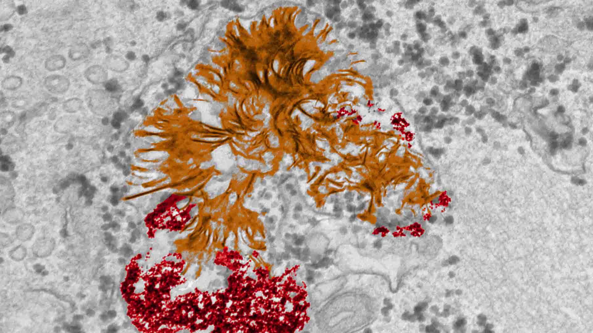 Image d’un lysosome observé en microscopie électronique en transmission, une méthode capable de révéler la forme de nanoparticules au sein même des cellules. Les produits de dégradation sont composés de cristaux d’or de 2 nm de diamètre auto-organisés en nano-feuillets. Les nanoparticules non dégradées sont en rouge et les produits de dégradation en orange© Alice Balfourier, laboratoire MSC (CNRS/Université Paris Cité) et Christine Péchoux-Longin (plateforme MIMA2, INRA)