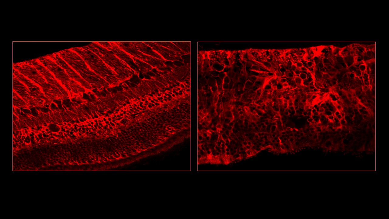 À gauche : Rétine humaine normale avec marquage en rouge des cellules gliales
