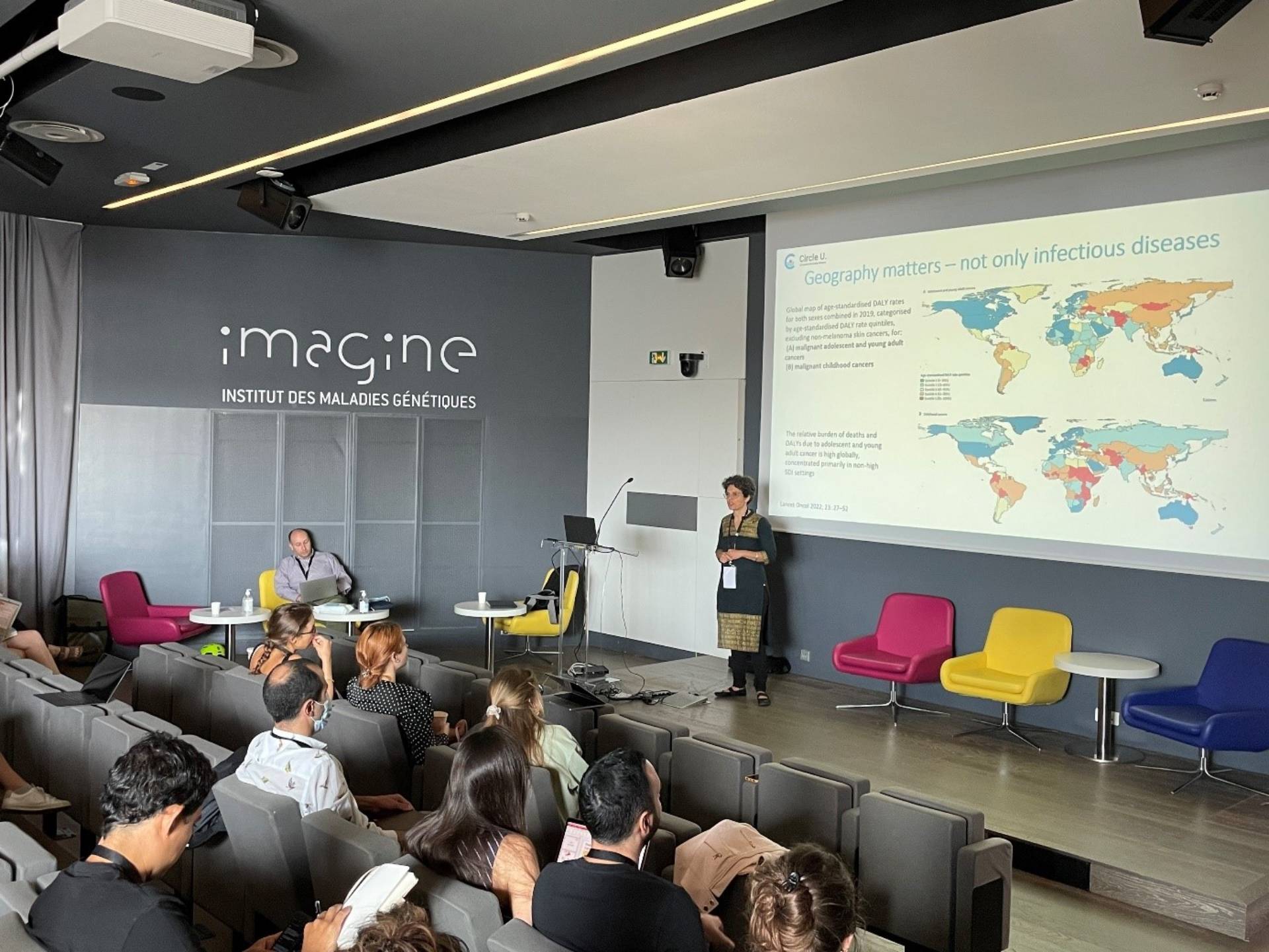 Université Paris Cité a eu le plaisir d’accueillir 36 doctorantes, doctorants et jeunes chaleureuses et chercheurs des neuf universités Circle U. pour la première école d’été Circle U. en Santé Globale intitulée « Rethinking Global Health ». L’école d’été s’est déroulée du 4 au 8 juillet 2022 à l’Institut Imagine.
