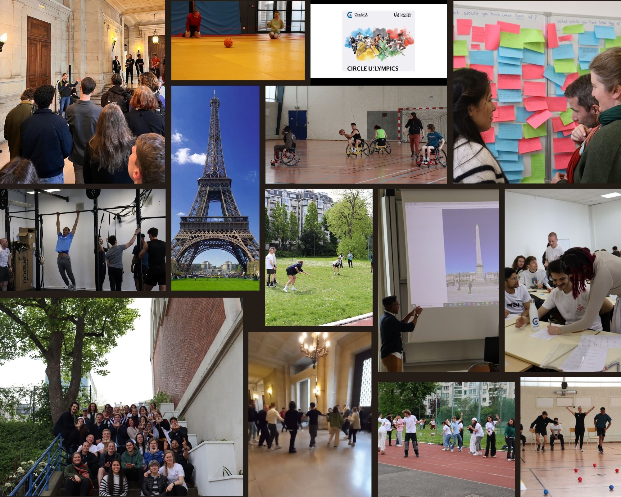 Ces réunions mensuelles se sont poursuivies par une rencontre d’une semaine dans les locaux de l’UFR STAPS à Paris où plusieurs de ses athlètes de haut niveau se préparent actuellement à porter les couleurs de leur pays et de leur université à l’occasion des Jeux Olympiques. Unis autour des mêmes valeurs de solidarité et d’engagement collectif, les participants ont pu visiter le siège de l’université de Paris Cité, prendre part à un atelier ‘fresque du climat’, participer à des compétitions sportives et se sensibiliser au handisport ! Ils ont également pu en profiter pour découvrir Paris et les sites des jeux olympiques, s’arrêter devant la déclaration des Droits de l’Homme au musée Carnavalet et admirer l’exposition du musée de la Monnaie où les premières médailles olympiques ont été fabriquées depuis la reprise des JO en 1896. Cette semaine bien chargée s’est clôturée par la remise des certificats Circle U. pour les 33 étudiants venus du Royaume Uni, de Serbie; de Norvège, de Belgique, d’Italie, d’Autriche, du Danemark et bien sûr de l’université Paris Cité.