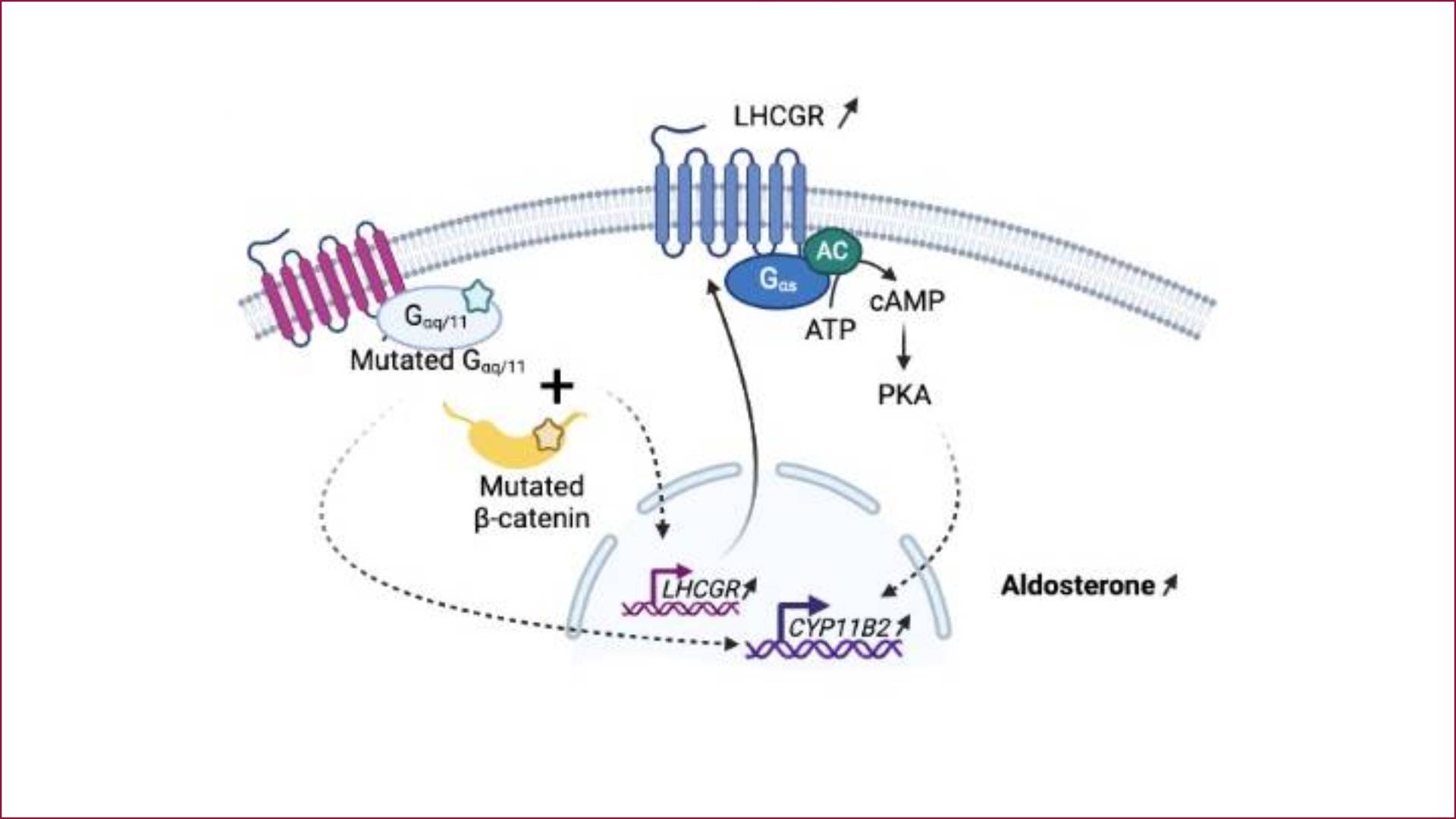 Ils ont ensuite montré que la présence de ces mutations résultait en une augmentation de la production d’aldostérone et était associée à un profil d’expression génique particulier avec, de façon remarquable, une augmentation de l’expression du récepteur à la LH (hormone lutéinisante) et à l’HCG (hormone Chorionique Gonadotrope), LHCGR, profil pouvant expliquer l’apparition des adénomes lors de pics hormonaux de LH ou HCG.